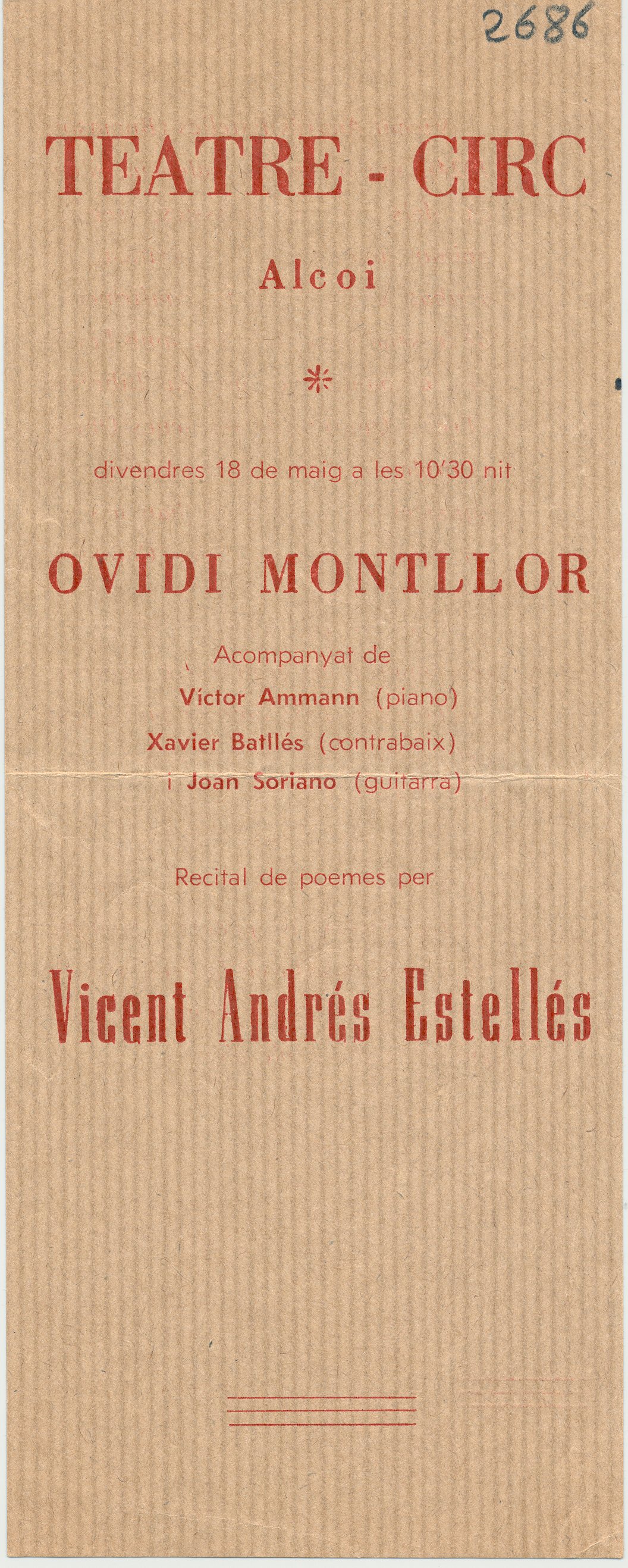 s.d. Teatre, Circ Alcoi. Ovidi Montllor. Recital de poemes per Vicent Andrés Estellés. O. M; Victor Ammann; Xavier Batllés; Joan Soriano. Burjasot.