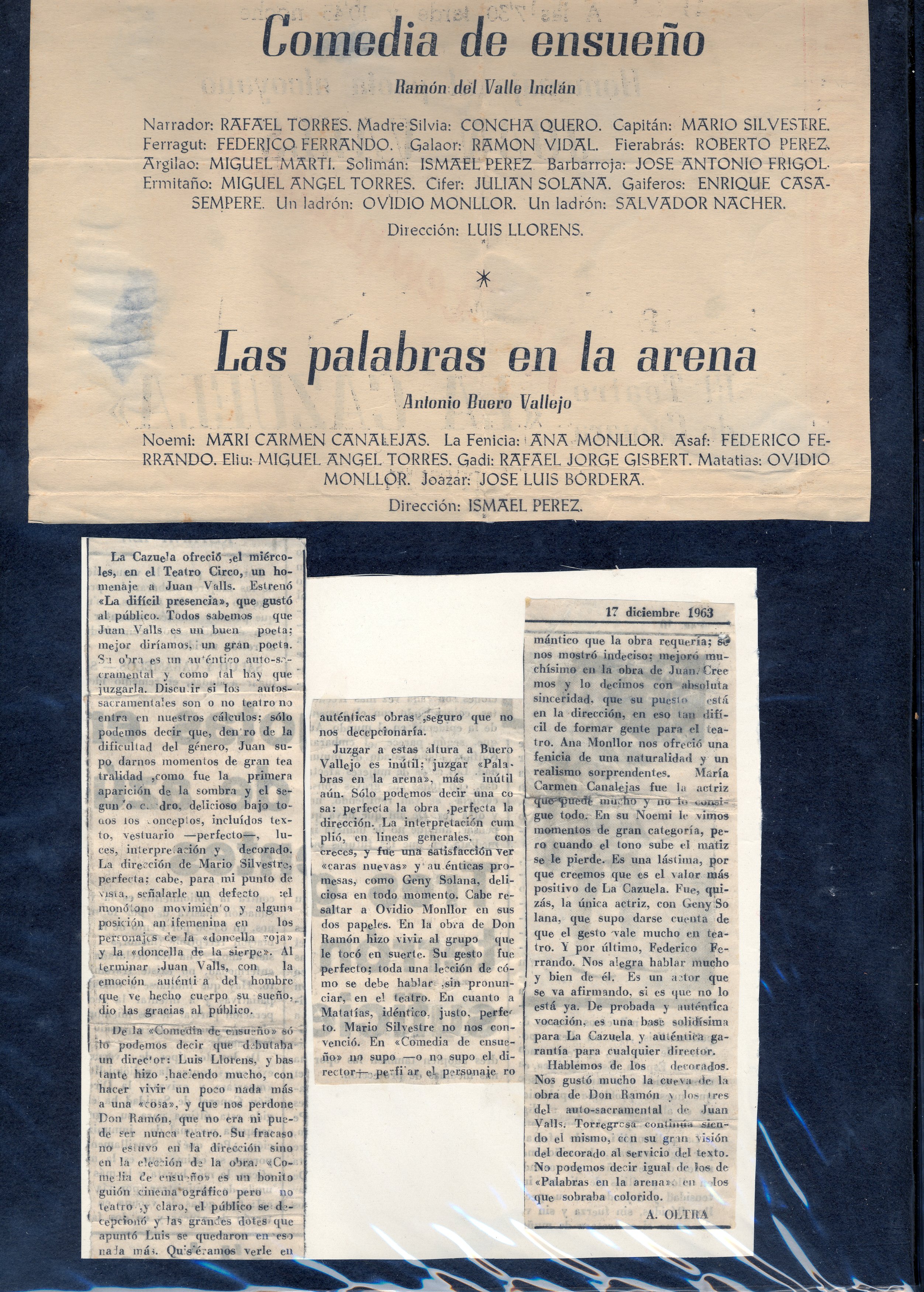 1963. Teatre la Cazuela. Alcoi. Carpeta. O. M. Inclou a més Recital de poesia romàntica; La muralla china; El Hombre de la flor en la boca; Comedia de ensueño; Las palabras en la arena; Los cuernos de don Friolera. I fotografies.