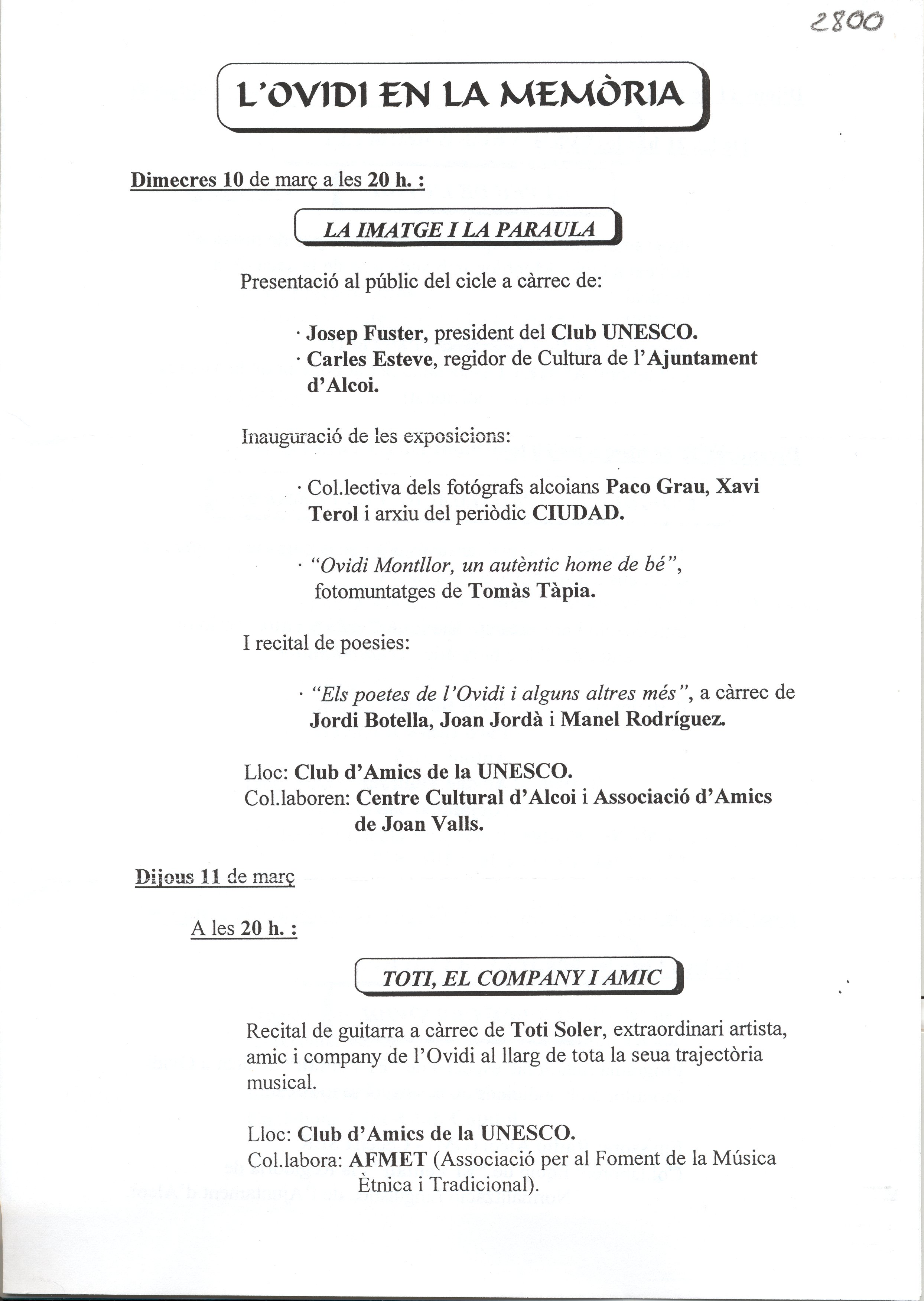 1999, març, 10. L’Ovidi en la memòria. Paco Grau; Toti Soler; Jordi Botella. Alcoi. Inclou altre fullet de mà tamany foli.