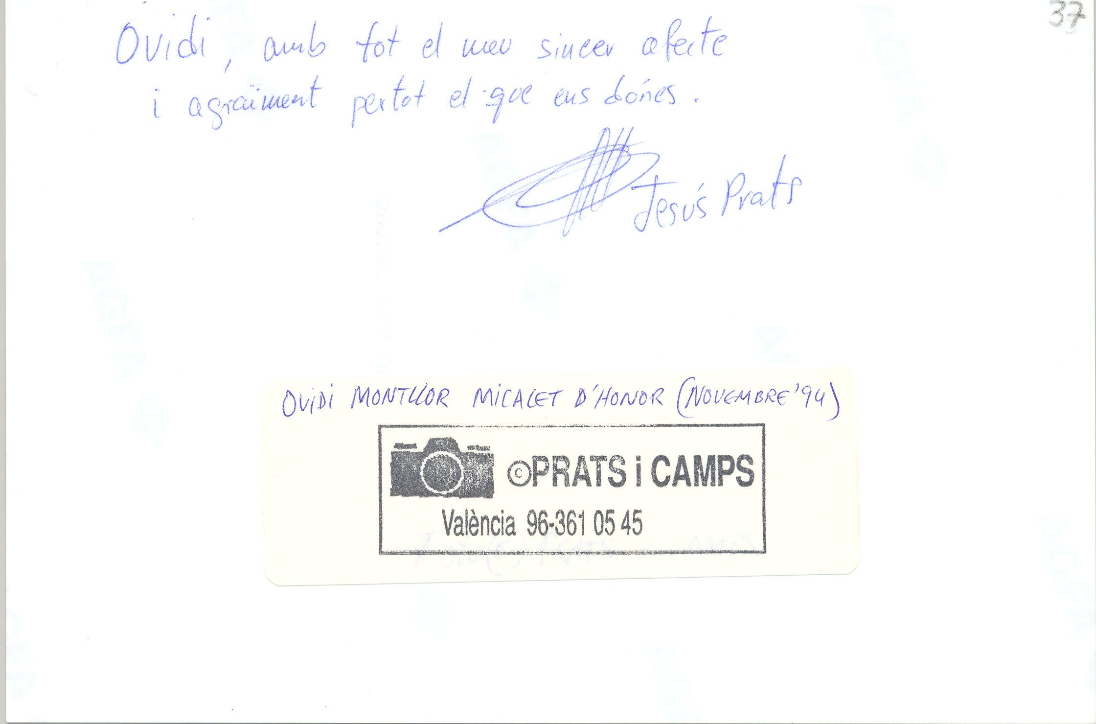 1994, novembre. Prats i Camps. Color. 13 x 19 cm. Fondo senyera, taula de sopar, aplaudint. Anotacions al darrere manuscrites de Prats, Jesús. Ovidi Montllor Micalet d’Honor. Solsona, Neus; O.M; Prat.
