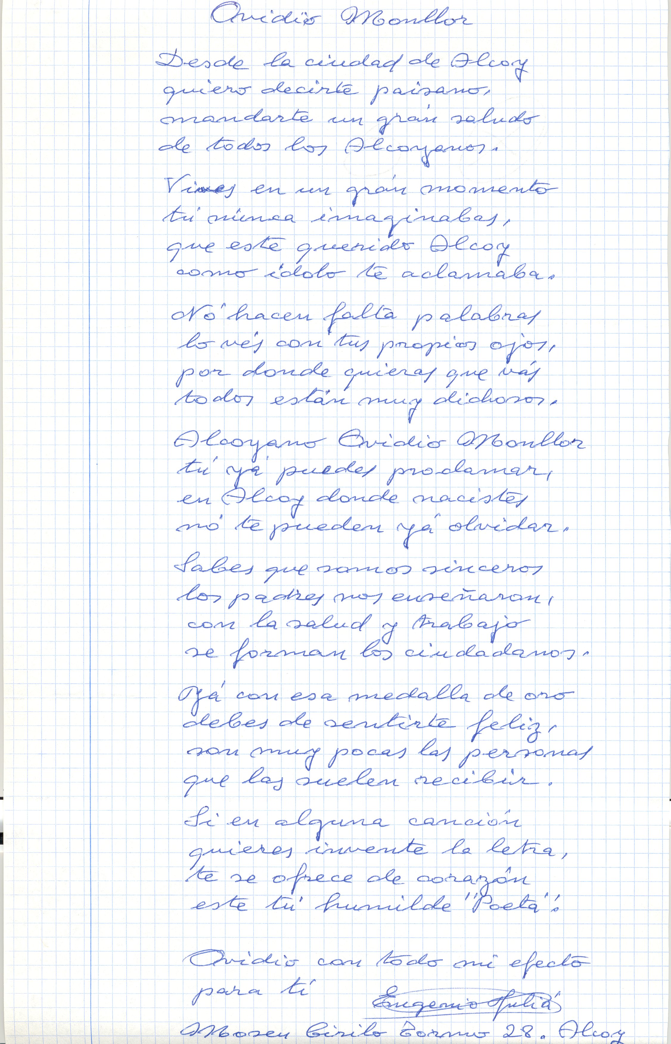 s.d. Carta manuscrita. Alcoi. 1 full . De Julià, Eugenio, felicitació per la medalla d’or. Marcada amb una x.