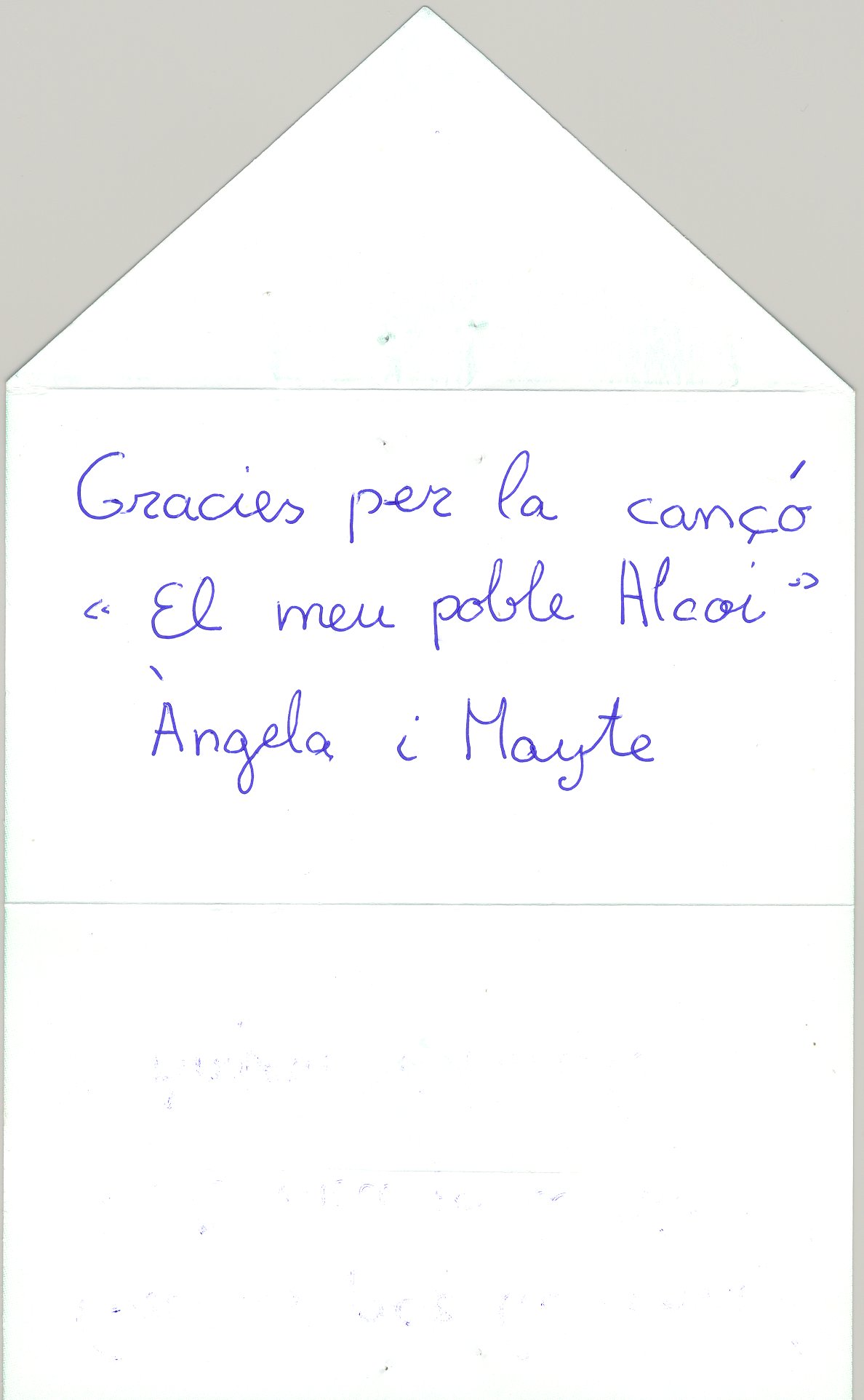 s.d. Alcoi. Targeta manuscrita. Tarjeta de la floristeria La Rosa d’Alcoi, signada per Angela i Mayte.