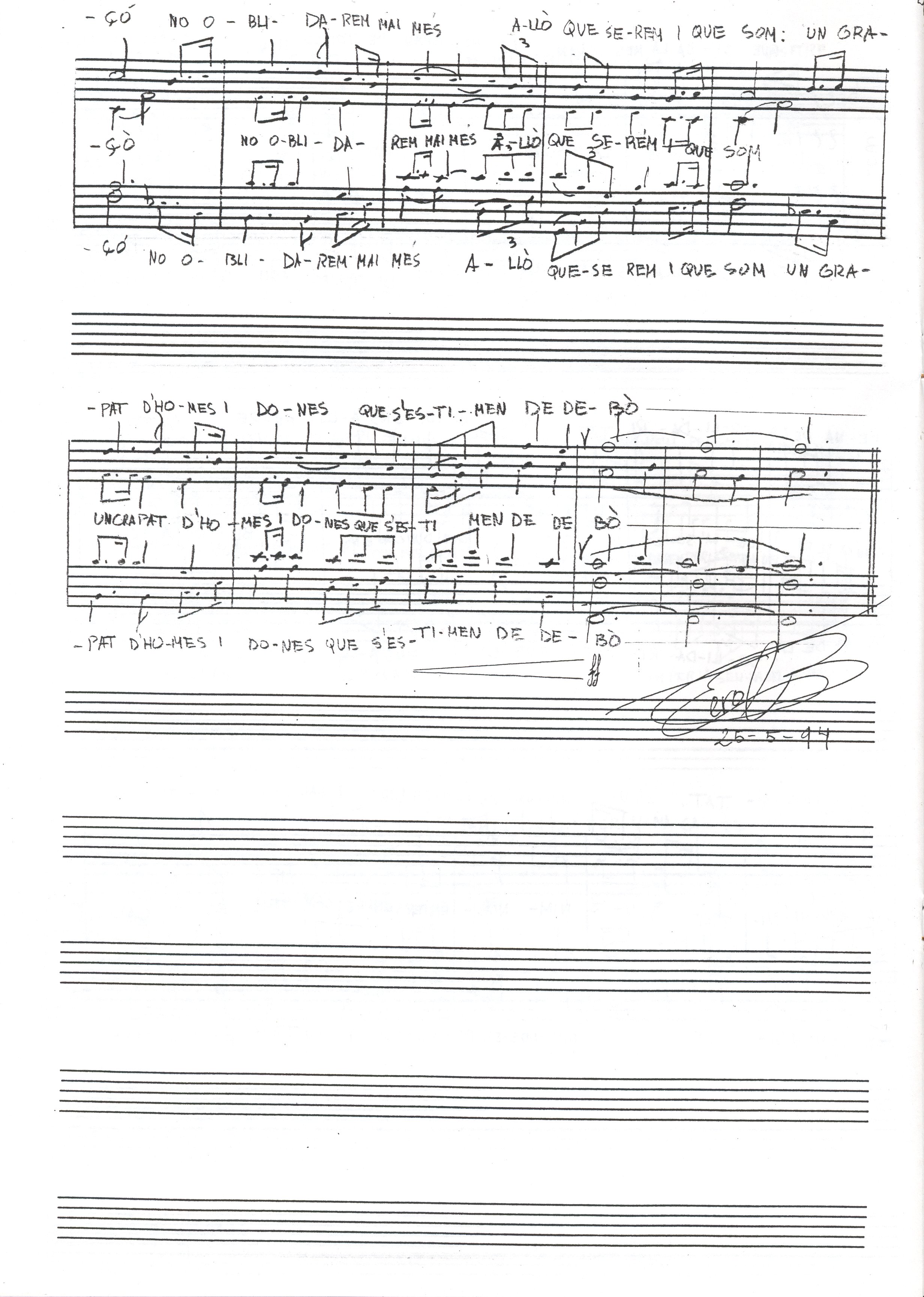 1994, maig, 25. Partitura. Carpeta que conté partitura i lletra de La Cançó de la Vella Llibertat de Pozo, Francesc; Terol, Eduard. Lletra mecanoscrita i partitura manuscrita. Dedicatoria manuscrita.
