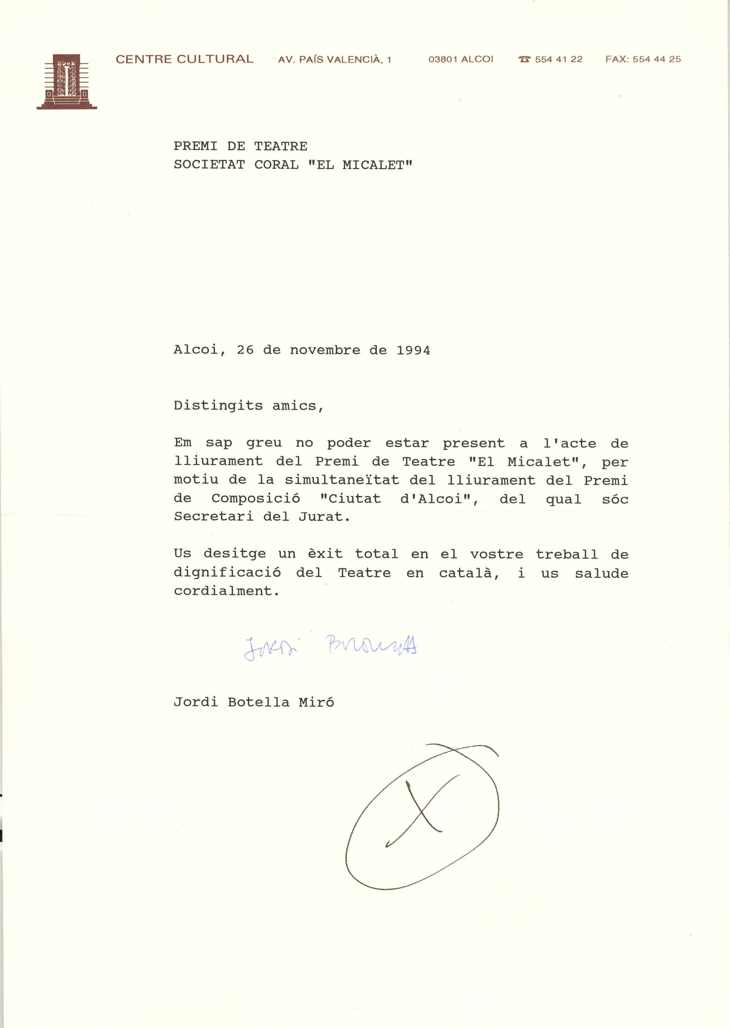 1994, novembre, 26. Alcoi. Carta mecanoscrita. 1 full. Botella Miró, Jordi a Ovidi. Marcada amb una x.