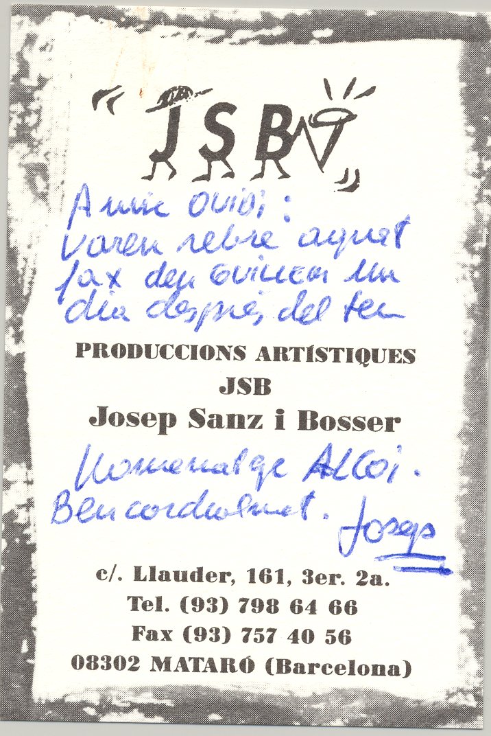 1994, novembre, 28. Fax mecanoscrit. Un poema dedicat a Ovidi: Tampoc el foc, signat per d’Efar, Guillem, i una tarjeta de visita de Produccions Artístiques Josep Sanz i Bosser, amb anotacions manuscrites per Ovidi, remitint, li fax.
