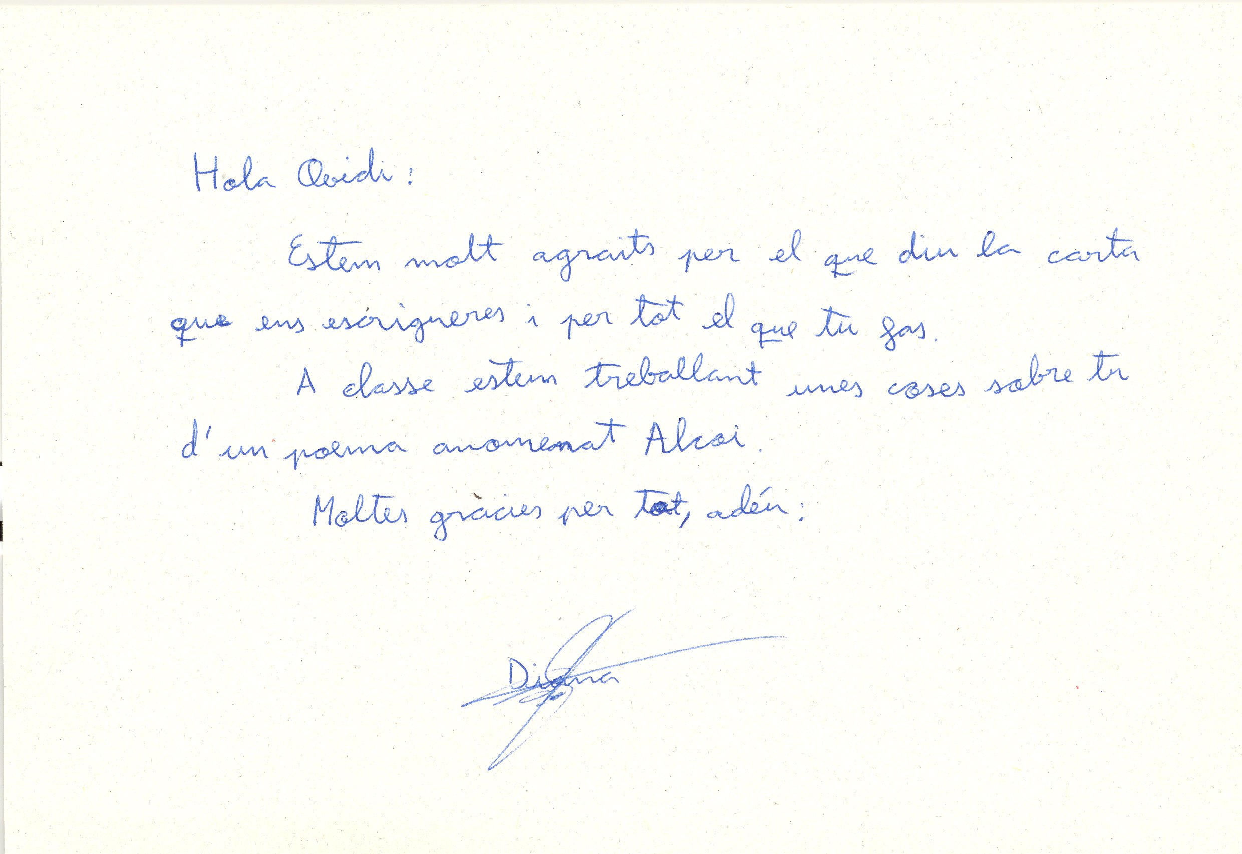1995, gener, 31. Alcoi. Cartes manuscrites. 14 fulls. Sobre compost per 14 cartes dels alumnes del Col·legi Públic El Romeral. Ferrando Sala, Enric; M.R., Lidia; S.S., Jaume; Diana; M.S., Rosella; Núria; Olcina, Anna; S.M; Jose; Paula; S.F, Ana; Llinares, Ma; Mayor, P; R.S., Neus; R., Vicent (mestre).