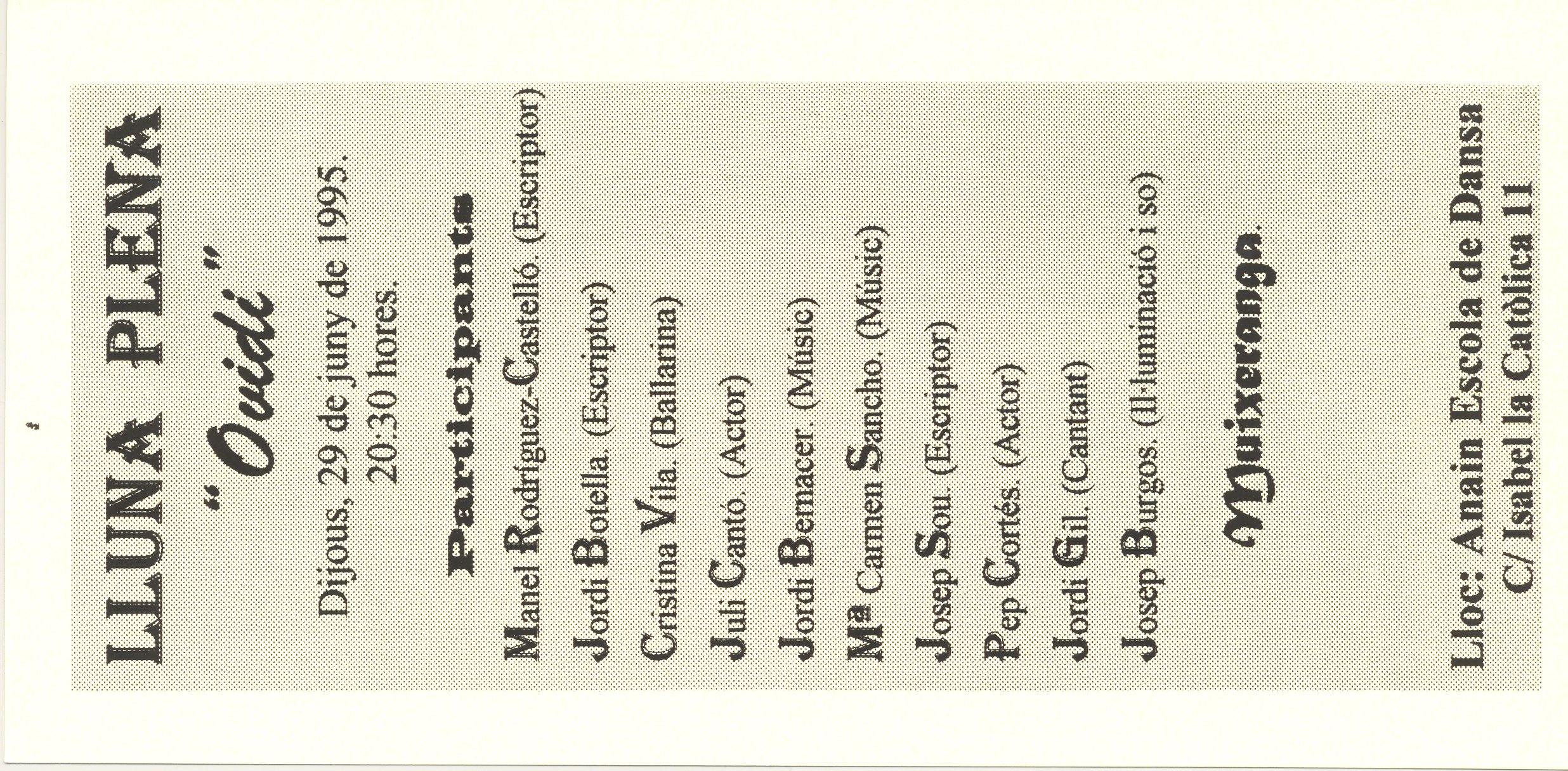1995, juny, 23. Alcoi. Carta mecanoscrita. 1 full. 1 programa de mà. Sobre per Mirò, Antoni, que conté 1 carta mecanoscrita de la Llibreria la Lluna convidant a presentació cicle anual Lluna Plena dedicat a O. M.. Signada per Moltó, Matilde. 1 programa de mà. Rodríguez, Castelló, Manel; Botella, Jordi; Vila, Cristina; Cantó, Juli; Bernàcer, Jordi; Sancho, M.ª Carmen; Sou, Josep; Cortés, Pep; Gil, Jordi; Burgos, Josep.