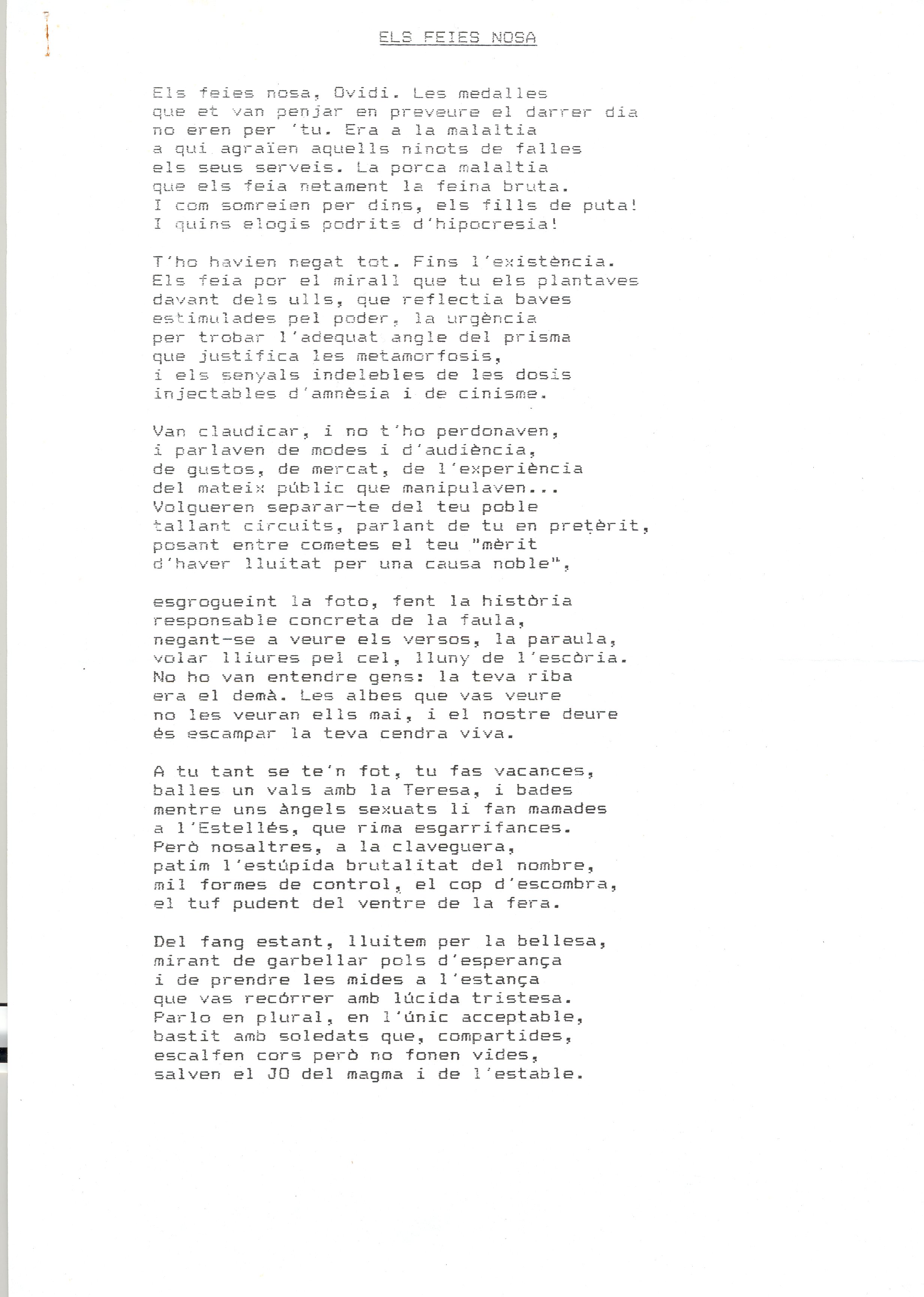 1995, agost. Poema mecanoscrit. 2 fulls. Poema: Els feies nosa. Signat per Pujadó, Miquel.