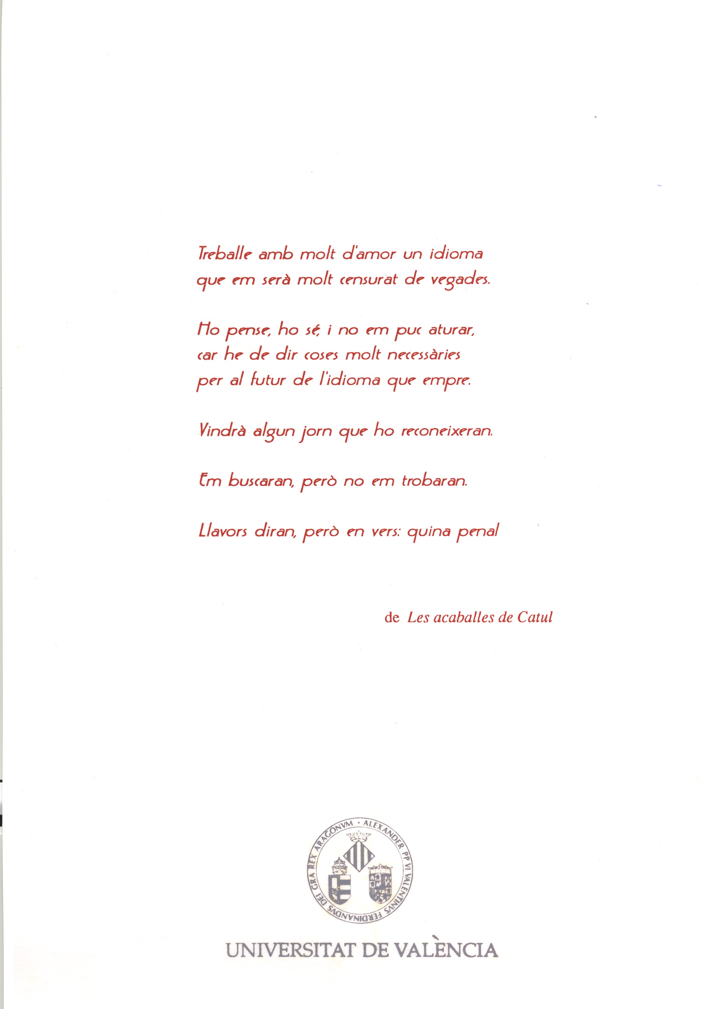1993, maig, 27. València. Carpeta. V. A. Estellés Doctor Honoris Causa, a títol postum, per la Universitat de València. Carpeta formada per 1 carta del rector de la U. De V. Lapiedra Civera, Ramón a O. M; 7 fotografies: 1 O. M. recitant; 3 concert de Bonet M.ª del Mar; 2 de l’acte de la investidura amb Lerma, J; Lapiedra Civera, Ramón; 1 de V. A. Estellés aplaudint; 2 fulls fotocopies del poema Assumiràs la veu d’un poble; 1 programa dels Premis Octubre de 1993 dedicats a V. A. Estellés, on apareix en pàgina 31 fotografia d’O. M. recitant en homenatge a V. A: Estellés.