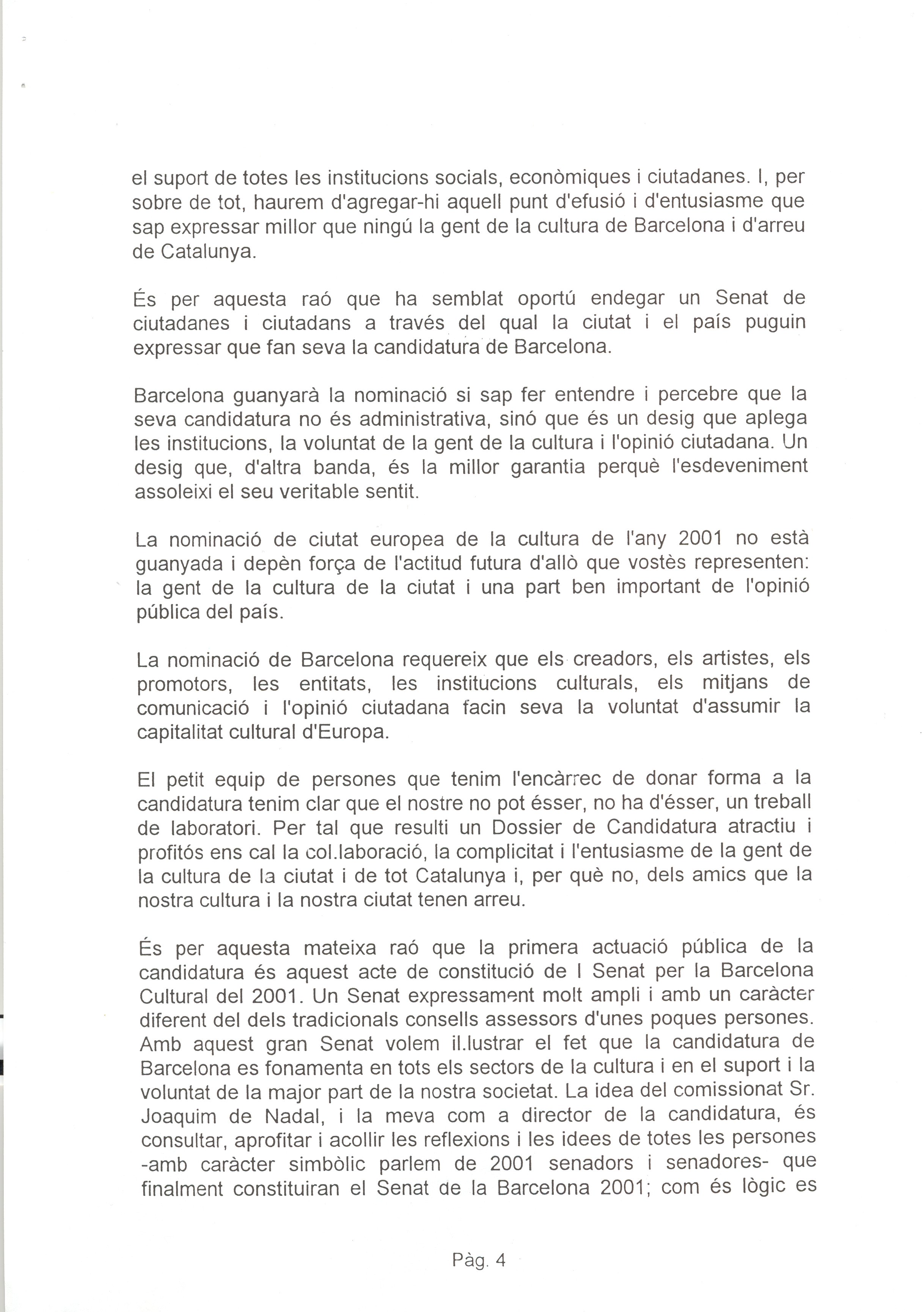 1994, setembre, 19. Barcelona. Carpeta. Barcelona 2001, Ciutat Europea de la Cultura. Carpeta amb enganxina de T.V.3, que conté 2 còpies del suport d’O. M. a la candidatura de Barcelona 2001, Ciutat Europea de la Cultura i el acceptament a formar part del Senat Ciutadà; 1 còpia mecanoscrita de 8 fulls del discurs de Mascarell, Ferran en l’acte de constitució del Senat Ciutadà.
