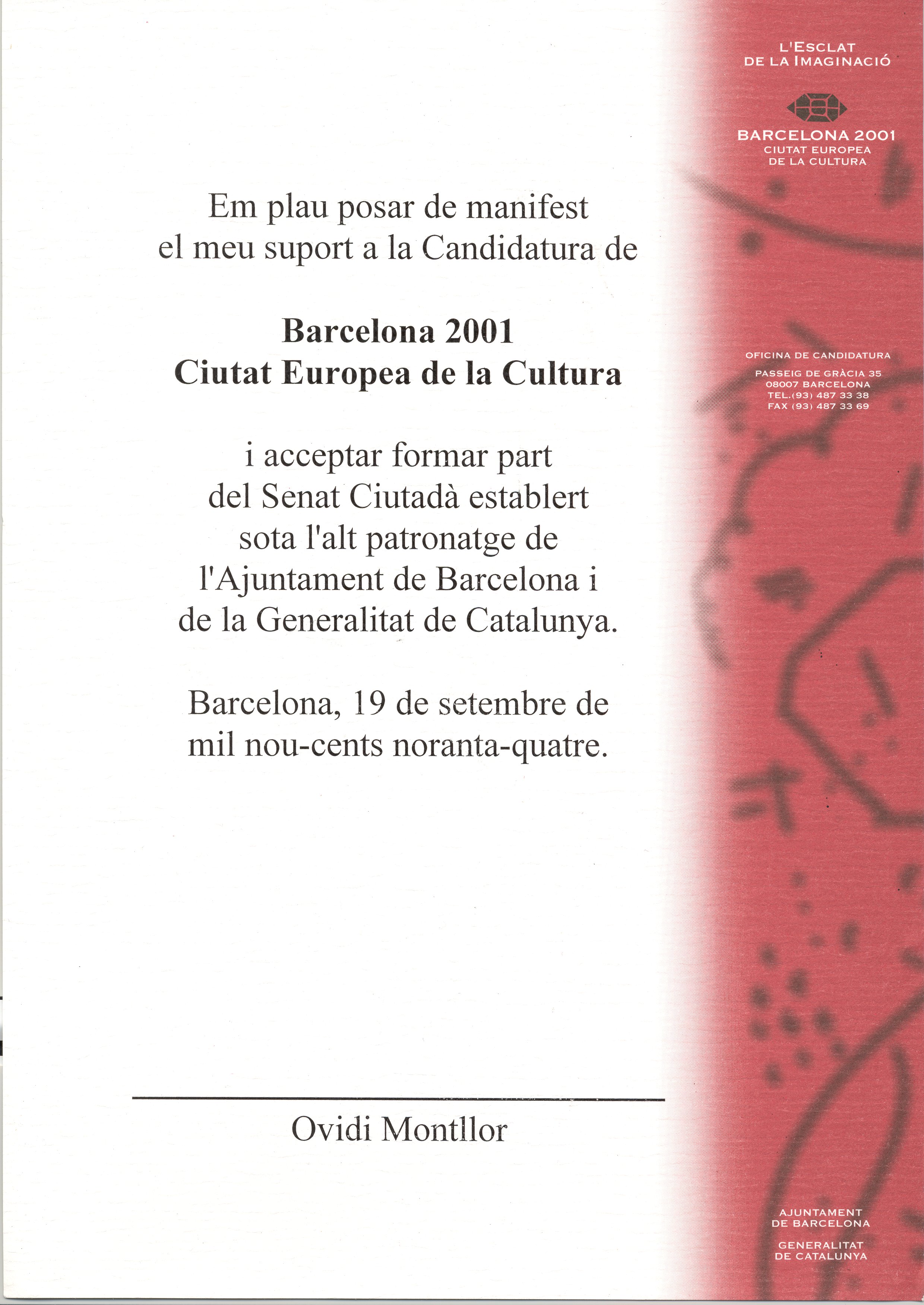 1994, setembre, 19. Barcelona. Carpeta. Barcelona 2001, Ciutat Europea de la Cultura. Carpeta amb enganxina de T.V.3, que conté 2 còpies del suport d’O. M. a la candidatura de Barcelona 2001, Ciutat Europea de la Cultura i el acceptament a formar part del Senat Ciutadà; 1 còpia mecanoscrita de 8 fulls del discurs de Mascarell, Ferran en l’acte de constitució del Senat Ciutadà.