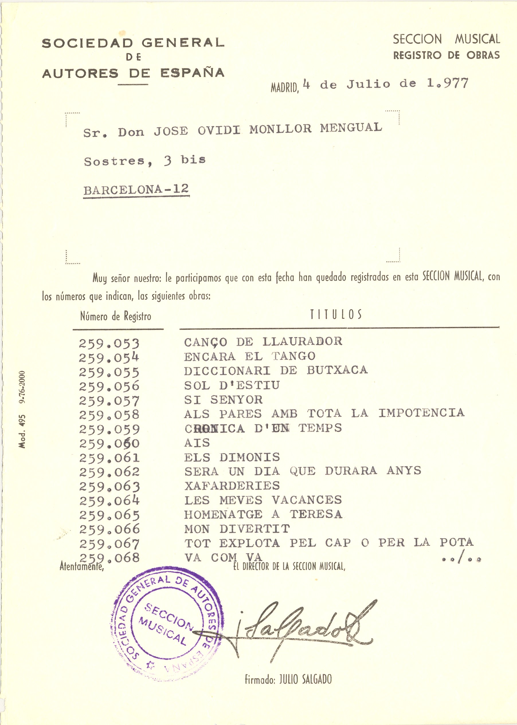 1985, novembre, 20 al 1995, gener, 27. Carpeta. SGAE. Carpeta formada per: 13 cartes mecanoscrites de un total de 39 fulls, inclou a més a més 1 repertori de cançons d’O. M. de 1982; El registrament de cançons d’O.M; Enregistrament de l’espectacle Ovidi Montllor diu Sagarra; Fulls de declaració de drets sobre les cançons d’Ovidi; Partitures presentades a l’SGAE; El repertori d’obres d’O. M. com a actor de cine i T.V; Drets d’autor com a actor d’O.M; Declaració de drets d’autor com a actor per l’AISGE; Contracte d’adhesió a l’AIE; Resum informatiu sobre Poliza col·lectiva d’accidents corporals de l’AIE; 2 revistes de l’AIE; 1 revista de l’AELC; Còpia de la compareixença davant la comissió de política cultural del parlament de Catalunya de l’ACIC.