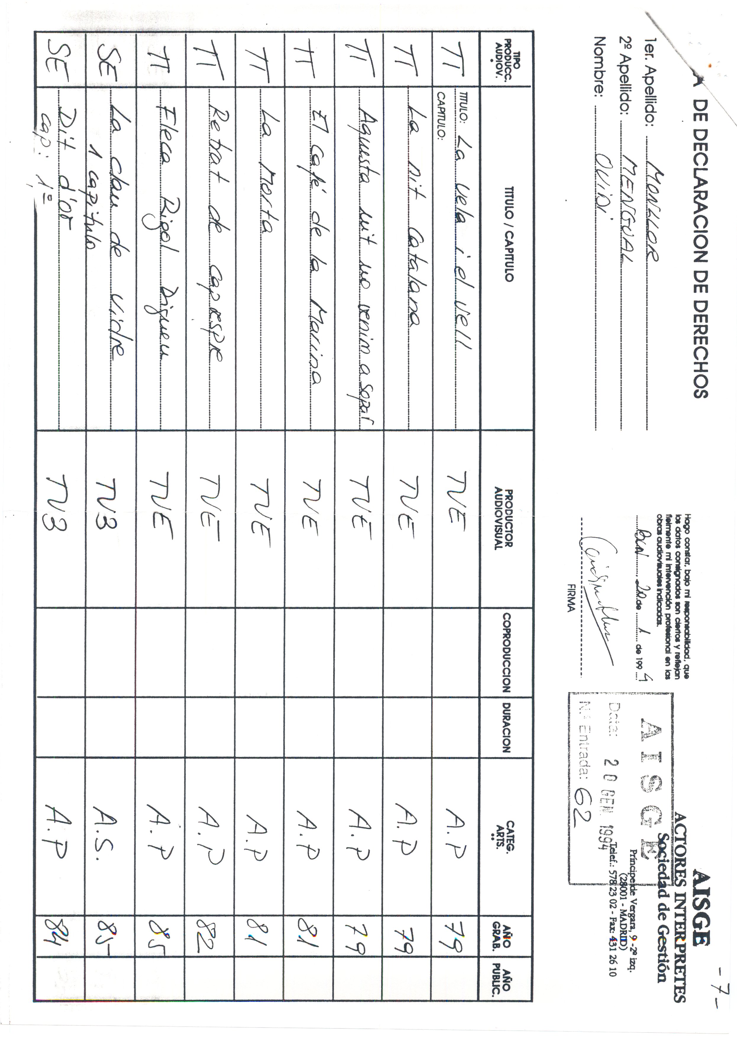 1985, novembre, 20 al 1995, gener, 27. Carpeta. SGAE. Carpeta formada per: 13 cartes mecanoscrites de un total de 39 fulls, inclou a més a més 1 repertori de cançons d’O. M. de 1982; El registrament de cançons d’O.M; Enregistrament de l’espectacle Ovidi Montllor diu Sagarra; Fulls de declaració de drets sobre les cançons d’Ovidi; Partitures presentades a l’SGAE; El repertori d’obres d’O. M. com a actor de cine i T.V; Drets d’autor com a actor d’O.M; Declaració de drets d’autor com a actor per l’AISGE; Contracte d’adhesió a l’AIE; Resum informatiu sobre Poliza col·lectiva d’accidents corporals de l’AIE; 2 revistes de l’AIE; 1 revista de l’AELC; Còpia de la compareixença davant la comissió de política cultural del parlament de Catalunya de l’ACIC.