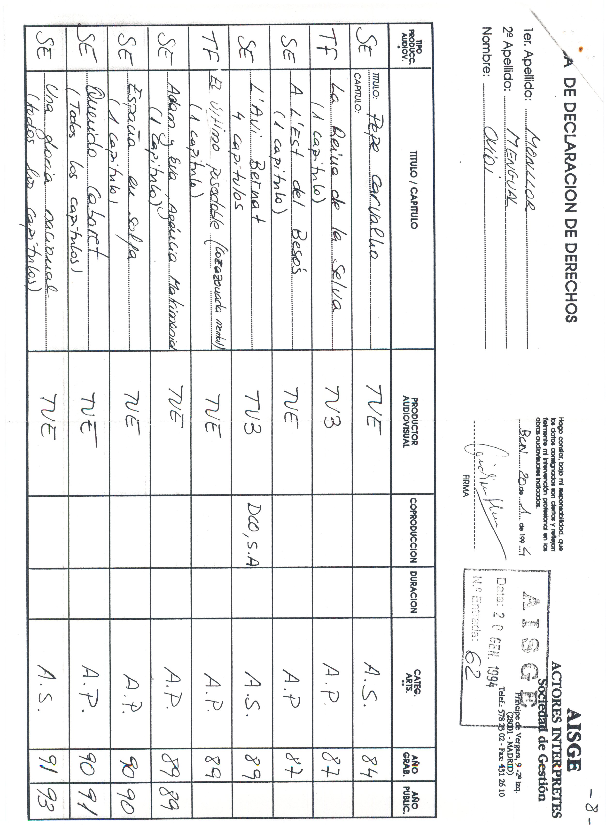 1985, novembre, 20 al 1995, gener, 27. Carpeta. SGAE. Carpeta formada per: 13 cartes mecanoscrites de un total de 39 fulls, inclou a més a més 1 repertori de cançons d’O. M. de 1982; El registrament de cançons d’O.M; Enregistrament de l’espectacle Ovidi Montllor diu Sagarra; Fulls de declaració de drets sobre les cançons d’Ovidi; Partitures presentades a l’SGAE; El repertori d’obres d’O. M. com a actor de cine i T.V; Drets d’autor com a actor d’O.M; Declaració de drets d’autor com a actor per l’AISGE; Contracte d’adhesió a l’AIE; Resum informatiu sobre Poliza col·lectiva d’accidents corporals de l’AIE; 2 revistes de l’AIE; 1 revista de l’AELC; Còpia de la compareixença davant la comissió de política cultural del parlament de Catalunya de l’ACIC.