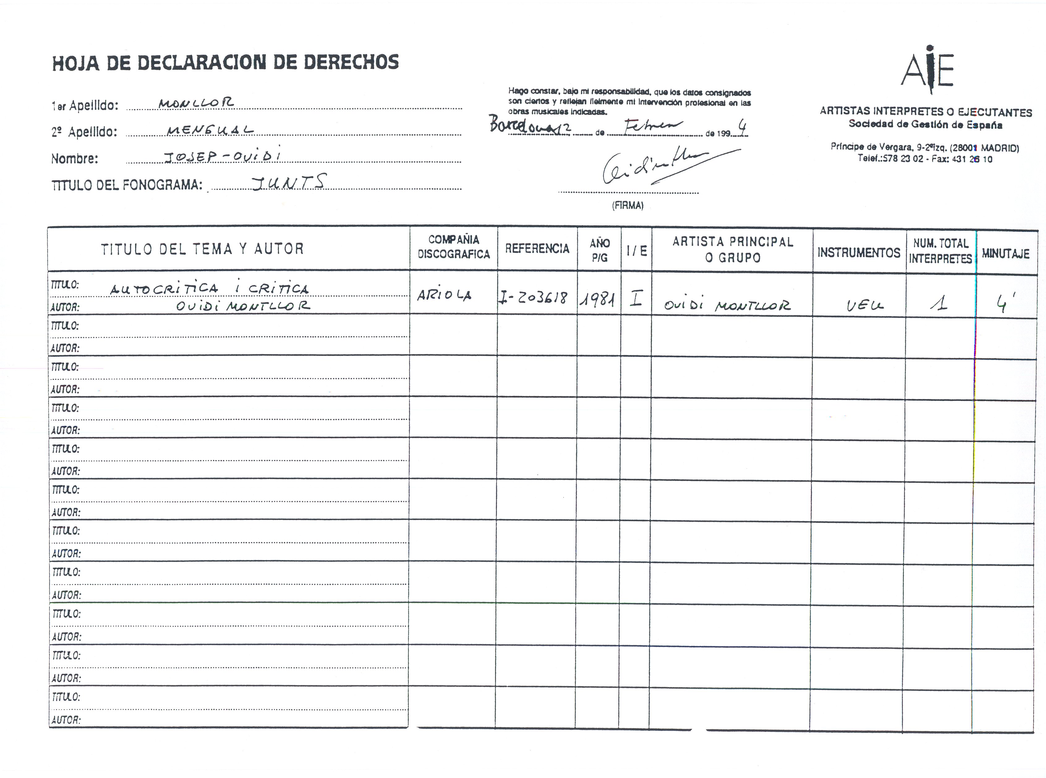 1985, novembre, 20 al 1995, gener, 27. Carpeta. SGAE. Carpeta formada per: 13 cartes mecanoscrites de un total de 39 fulls, inclou a més a més 1 repertori de cançons d’O. M. de 1982; El registrament de cançons d’O.M; Enregistrament de l’espectacle Ovidi Montllor diu Sagarra; Fulls de declaració de drets sobre les cançons d’Ovidi; Partitures presentades a l’SGAE; El repertori d’obres d’O. M. com a actor de cine i T.V; Drets d’autor com a actor d’O.M; Declaració de drets d’autor com a actor per l’AISGE; Contracte d’adhesió a l’AIE; Resum informatiu sobre Poliza col·lectiva d’accidents corporals de l’AIE; 2 revistes de l’AIE; 1 revista de l’AELC; Còpia de la compareixença davant la comissió de política cultural del parlament de Catalunya de l’ACIC.