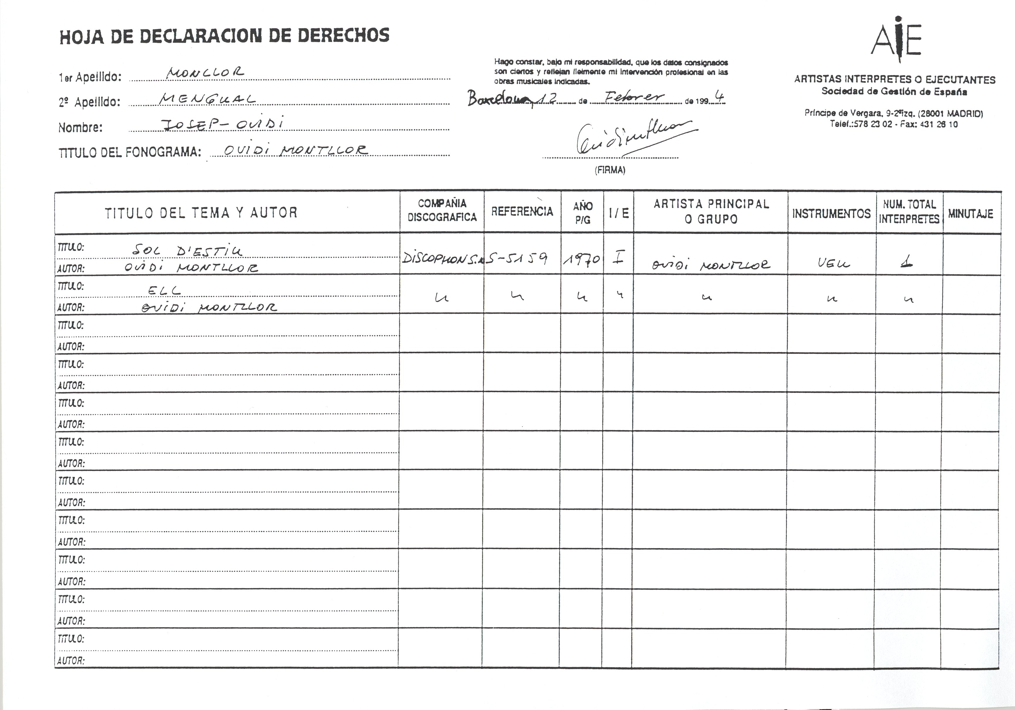 1985, novembre, 20 al 1995, gener, 27. Carpeta. SGAE. Carpeta formada per: 13 cartes mecanoscrites de un total de 39 fulls, inclou a més a més 1 repertori de cançons d’O. M. de 1982; El registrament de cançons d’O.M; Enregistrament de l’espectacle Ovidi Montllor diu Sagarra; Fulls de declaració de drets sobre les cançons d’Ovidi; Partitures presentades a l’SGAE; El repertori d’obres d’O. M. com a actor de cine i T.V; Drets d’autor com a actor d’O.M; Declaració de drets d’autor com a actor per l’AISGE; Contracte d’adhesió a l’AIE; Resum informatiu sobre Poliza col·lectiva d’accidents corporals de l’AIE; 2 revistes de l’AIE; 1 revista de l’AELC; Còpia de la compareixença davant la comissió de política cultural del parlament de Catalunya de l’ACIC.