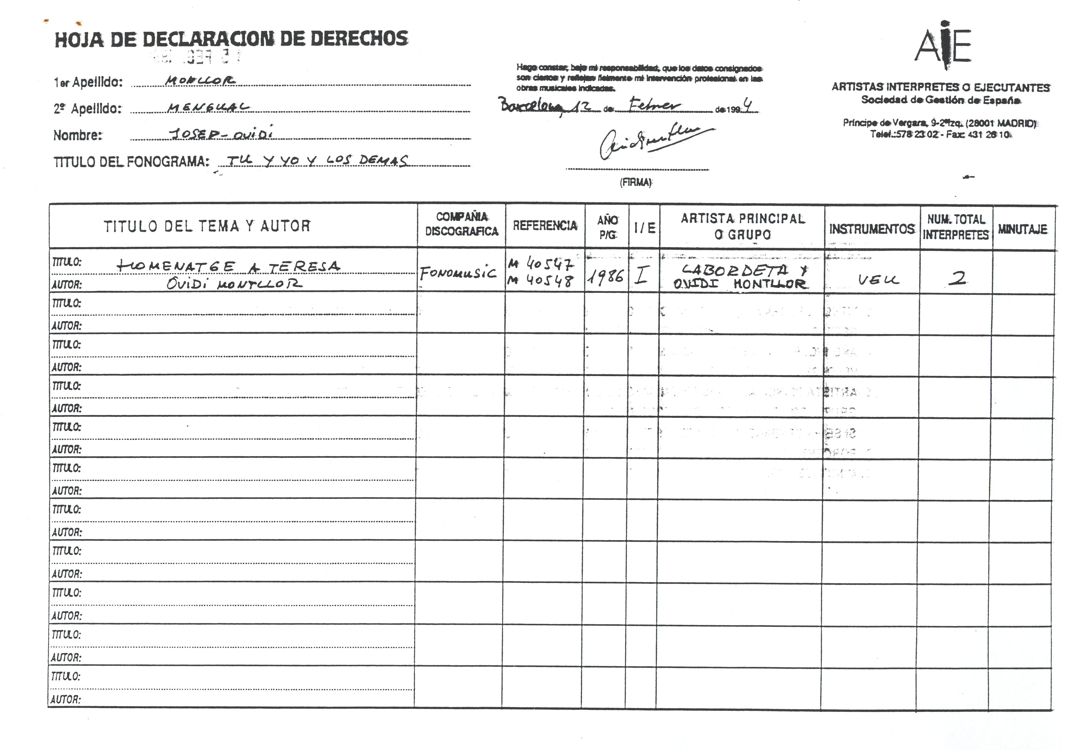 1985, novembre, 20 al 1995, gener, 27. Carpeta. SGAE. Carpeta formada per: 13 cartes mecanoscrites de un total de 39 fulls, inclou a més a més 1 repertori de cançons d’O. M. de 1982; El registrament de cançons d’O.M; Enregistrament de l’espectacle Ovidi Montllor diu Sagarra; Fulls de declaració de drets sobre les cançons d’Ovidi; Partitures presentades a l’SGAE; El repertori d’obres d’O. M. com a actor de cine i T.V; Drets d’autor com a actor d’O.M; Declaració de drets d’autor com a actor per l’AISGE; Contracte d’adhesió a l’AIE; Resum informatiu sobre Poliza col·lectiva d’accidents corporals de l’AIE; 2 revistes de l’AIE; 1 revista de l’AELC; Còpia de la compareixença davant la comissió de política cultural del parlament de Catalunya de l’ACIC.