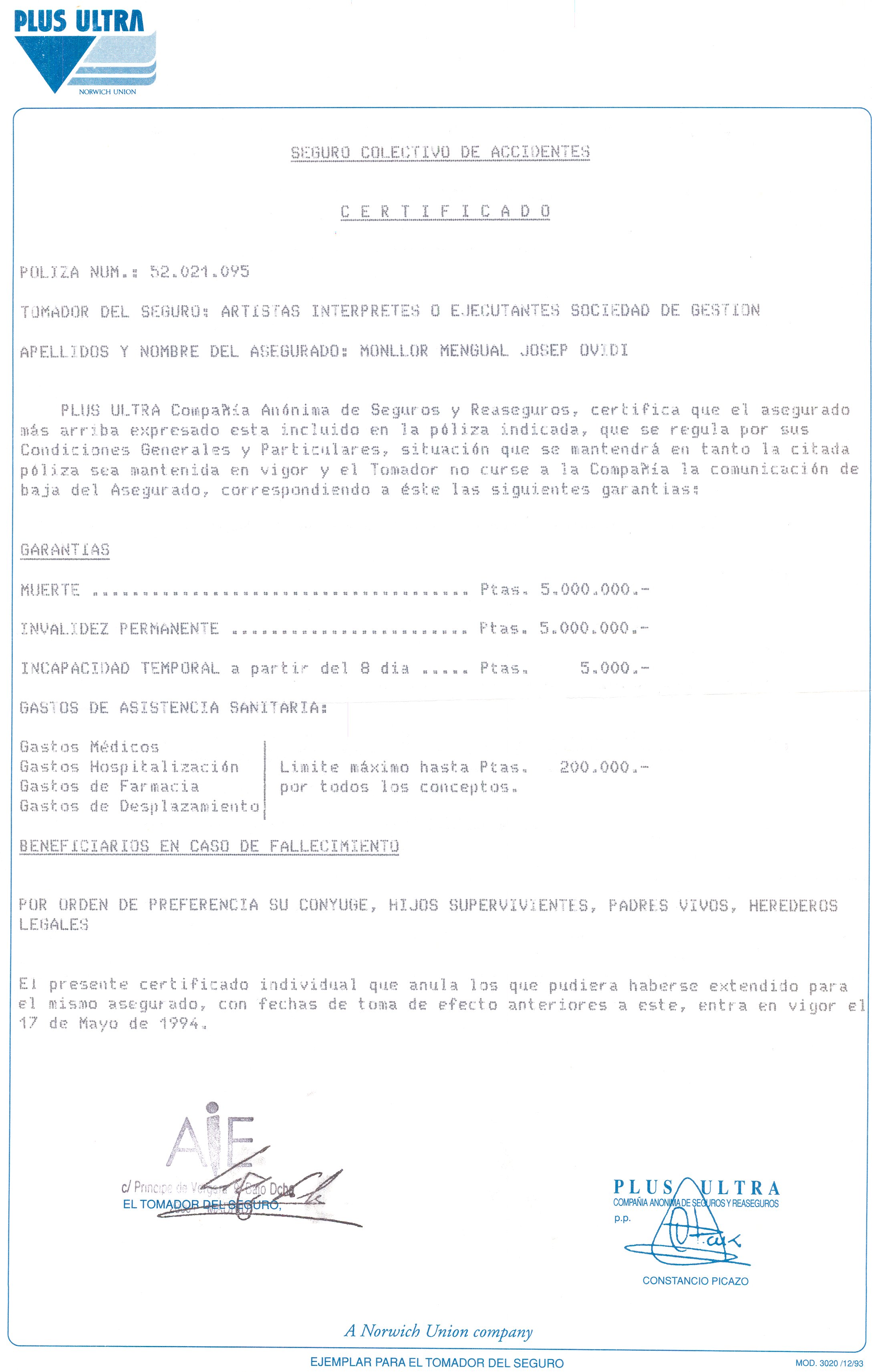 1985, novembre, 20 al 1995, gener, 27. Carpeta. SGAE. Carpeta formada per: 13 cartes mecanoscrites de un total de 39 fulls, inclou a més a més 1 repertori de cançons d’O. M. de 1982; El registrament de cançons d’O.M; Enregistrament de l’espectacle Ovidi Montllor diu Sagarra; Fulls de declaració de drets sobre les cançons d’Ovidi; Partitures presentades a l’SGAE; El repertori d’obres d’O. M. com a actor de cine i T.V; Drets d’autor com a actor d’O.M; Declaració de drets d’autor com a actor per l’AISGE; Contracte d’adhesió a l’AIE; Resum informatiu sobre Poliza col·lectiva d’accidents corporals de l’AIE; 2 revistes de l’AIE; 1 revista de l’AELC; Còpia de la compareixença davant la comissió de política cultural del parlament de Catalunya de l’ACIC.