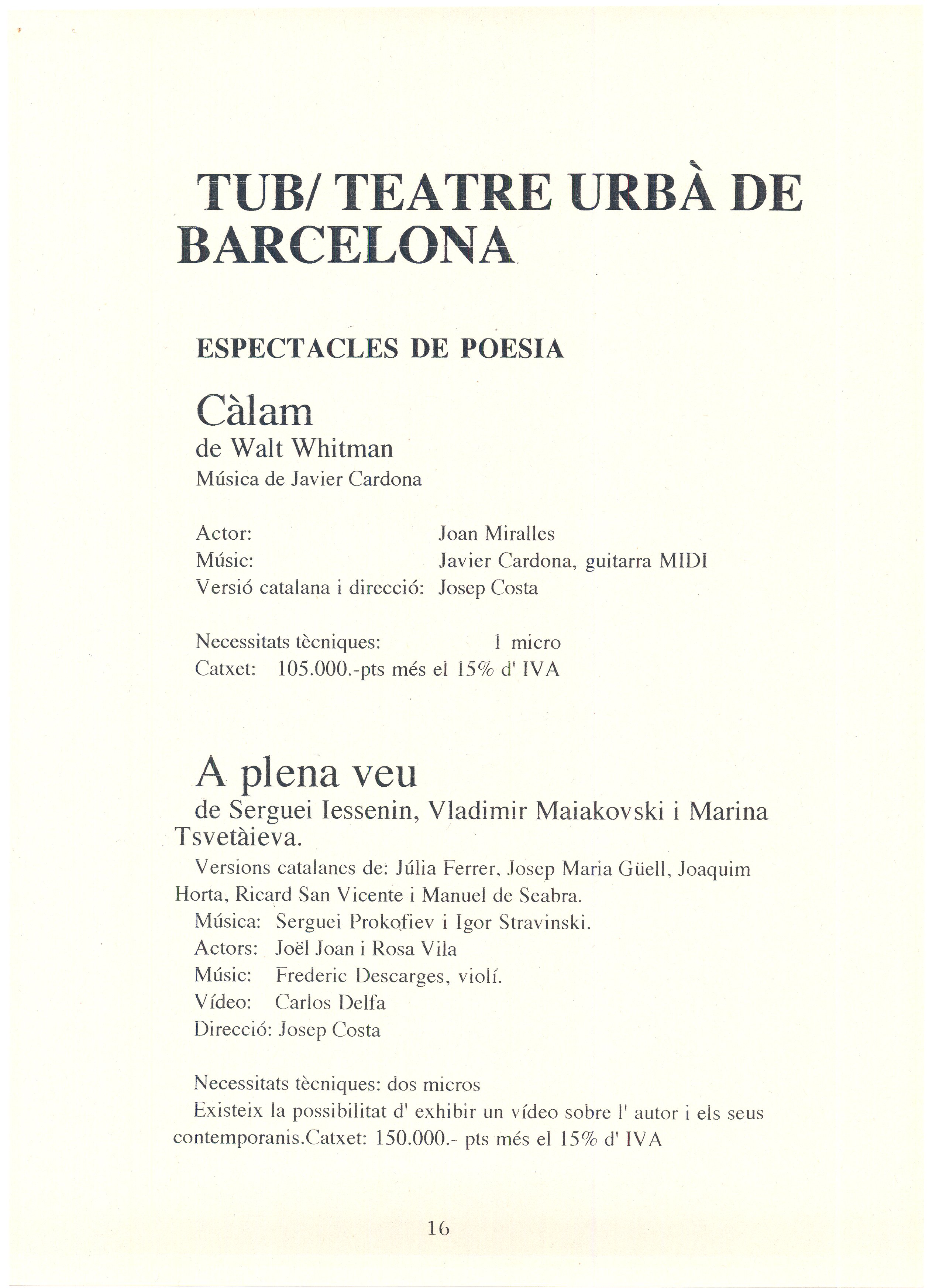 1993. Barcelona. Pues de poeta ’93. Programa de promoció d’espectacles amb textos poètics, lectures dramatitzades i lectures fetes pels mateixos poetes. Carpeta. Recull d’espectacles, on apareix O. M. i Toti Soler amb espectacle de poetes.