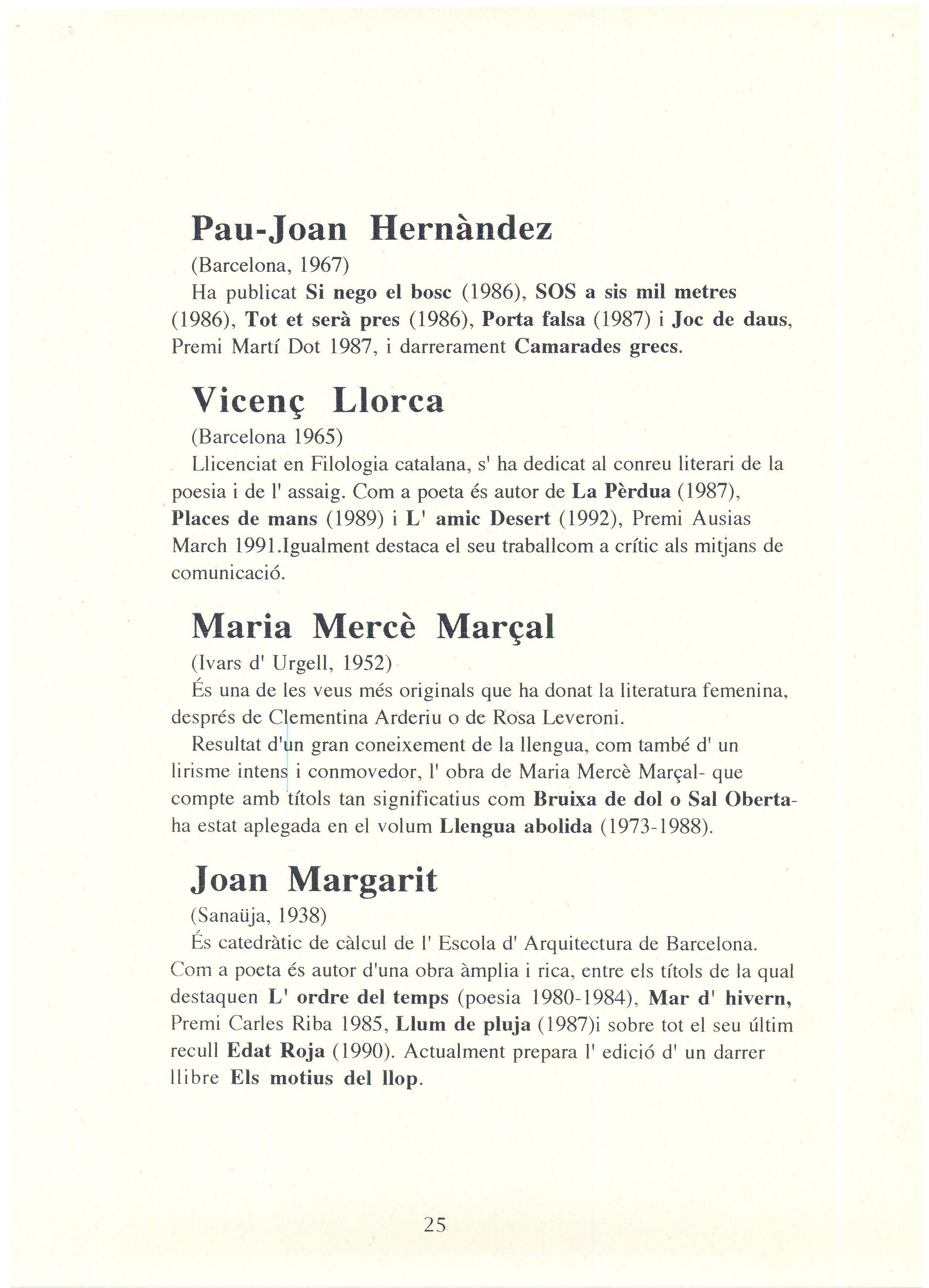 1993. Barcelona. Pues de poeta ’93. Programa de promoció d’espectacles amb textos poètics, lectures dramatitzades i lectures fetes pels mateixos poetes. Carpeta. Recull d’espectacles, on apareix O. M. i Toti Soler amb espectacle de poetes.