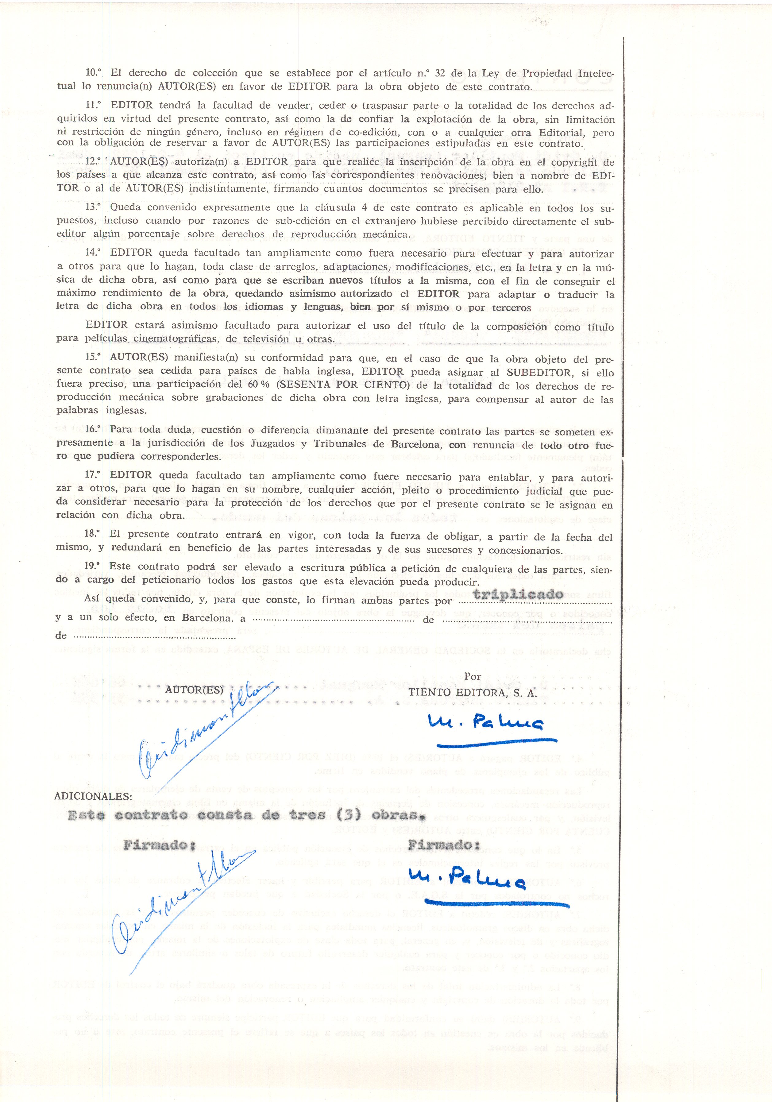 1974, octubre al 1994, gener, 27. Barcelona. Contractes T.V. Cèdules. Carpeta. 16 fulls de contractes amb TIENTO EDITORA; 123 fulls mecanoscrits de contractes per a cinema i T.V.