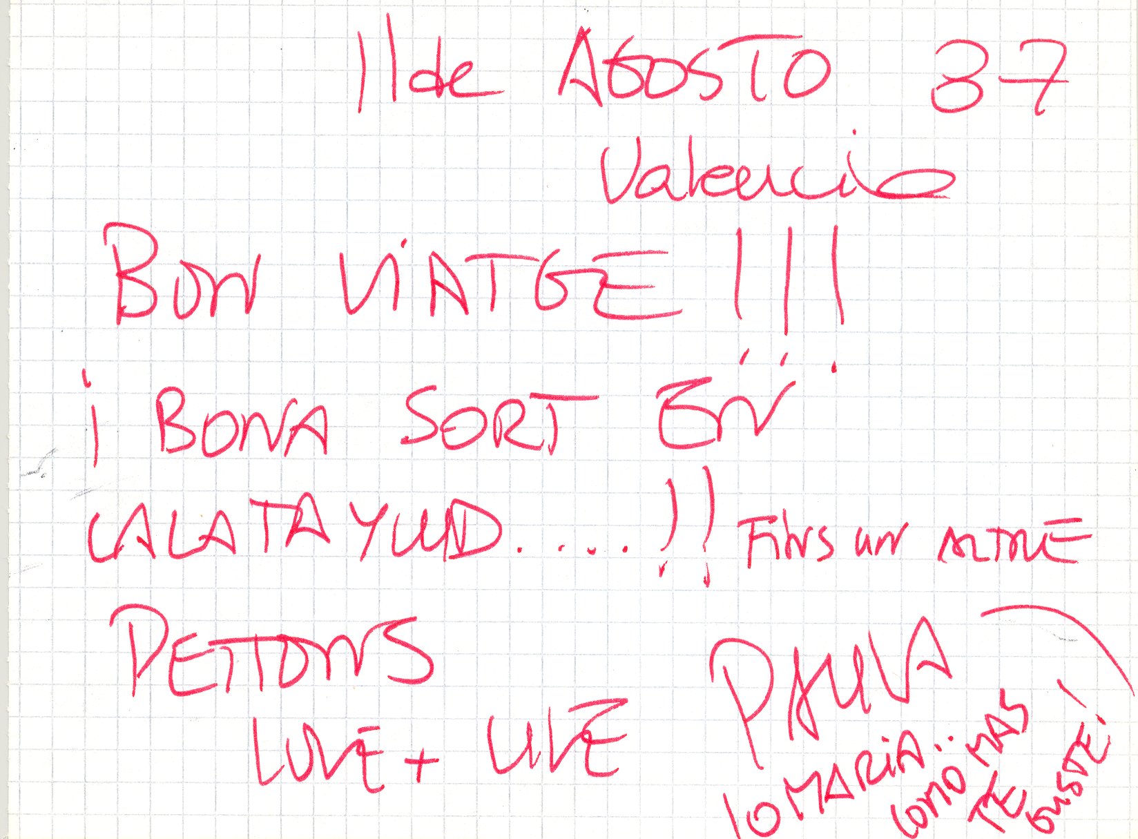 1987, agost, 11. València. Carta manuscrita. 1 full. De Paula de Vilallonga. Sobre rosa amb dibuix de cara i d’avió i 1 full.