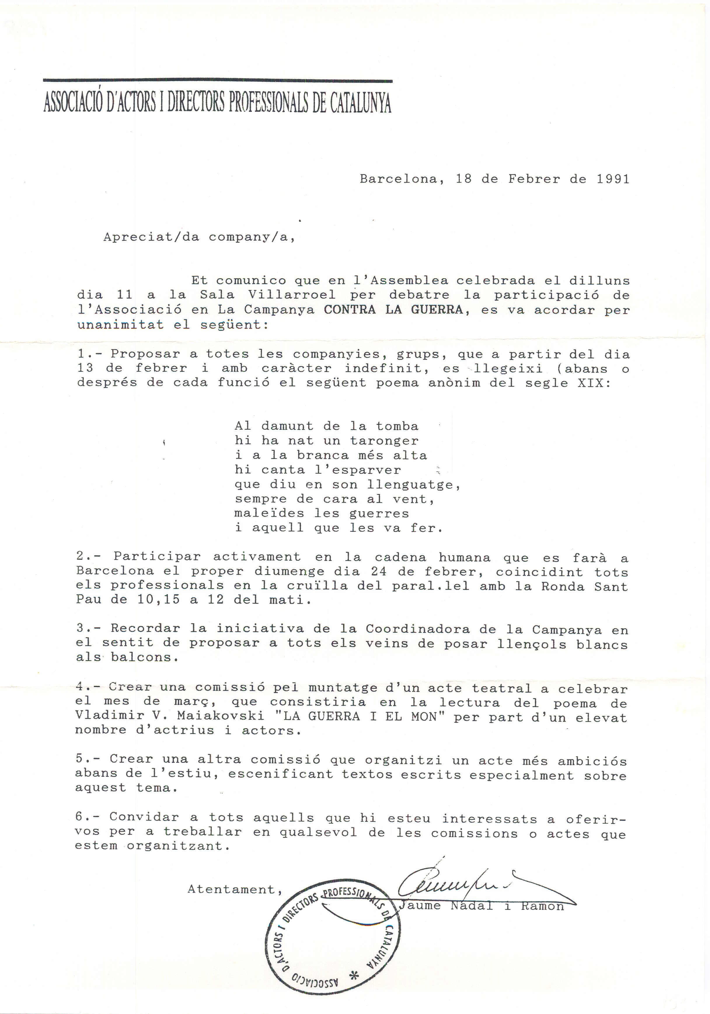 1991, febrer, 18. Barcelona. Carta mecanoscrita. 1 full. De l’Associació d’actors i directors profesionals de Catalunya, signada per Jaume Nadal i Ramón.