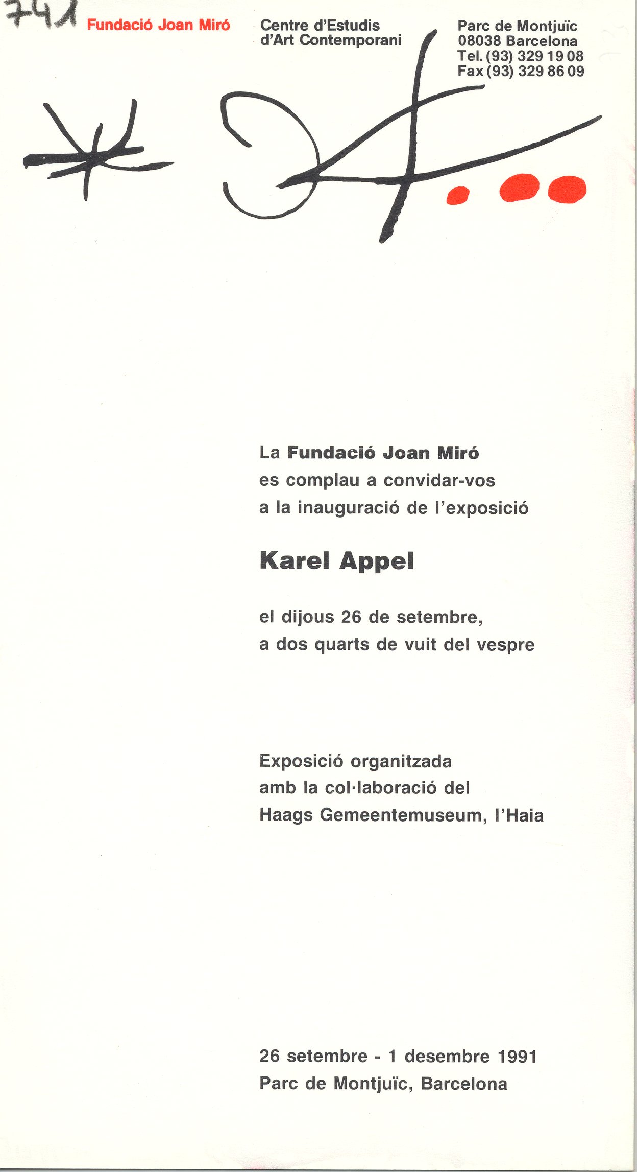 1991, setembre, 26. Postal mecanoscrita. Invitació de la Fundació Joan Miró a l’exposició de Karel Appel.
