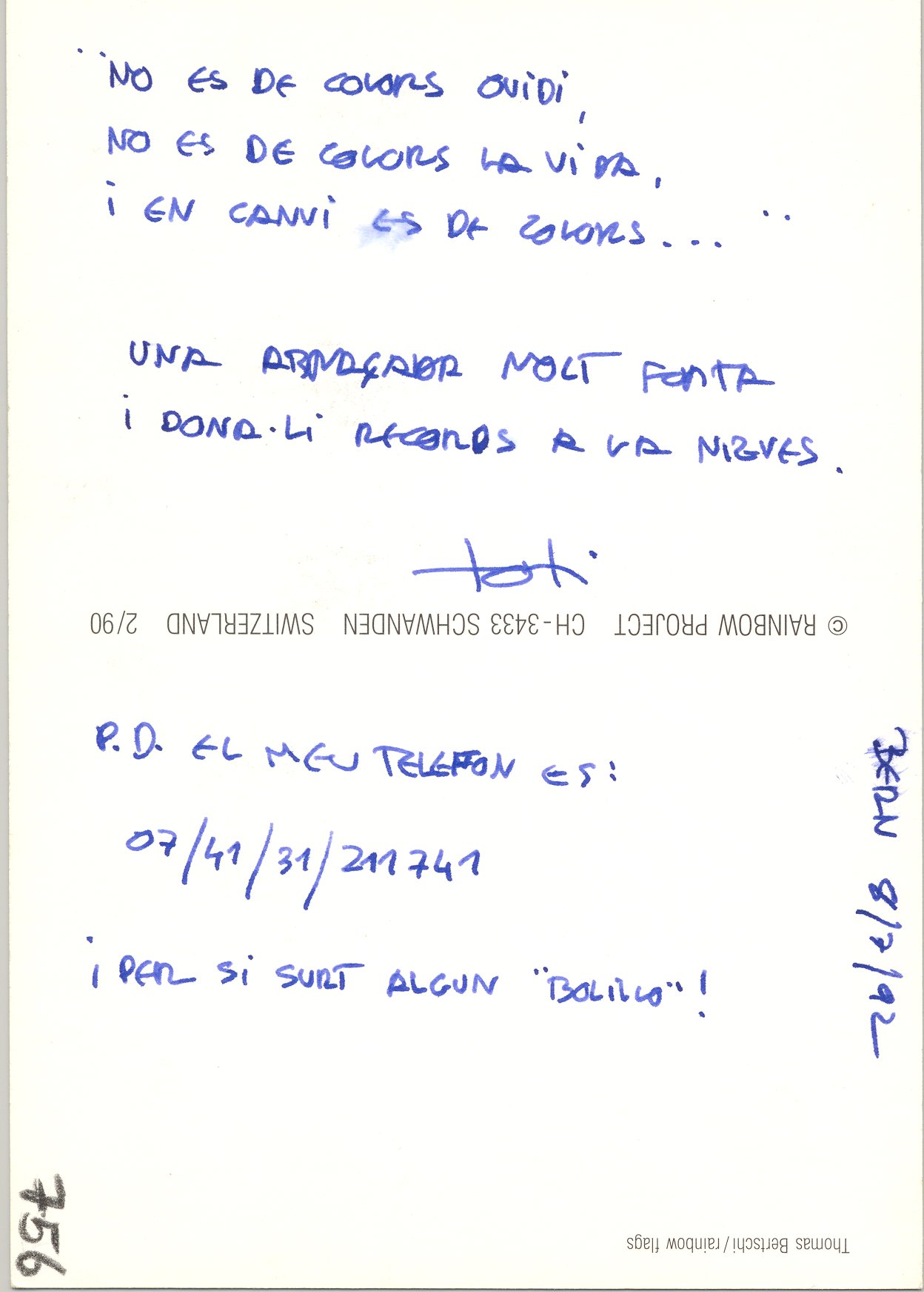 1992, juliol, 8. Postal manuscrita. De Toti. Nieves. Bern.