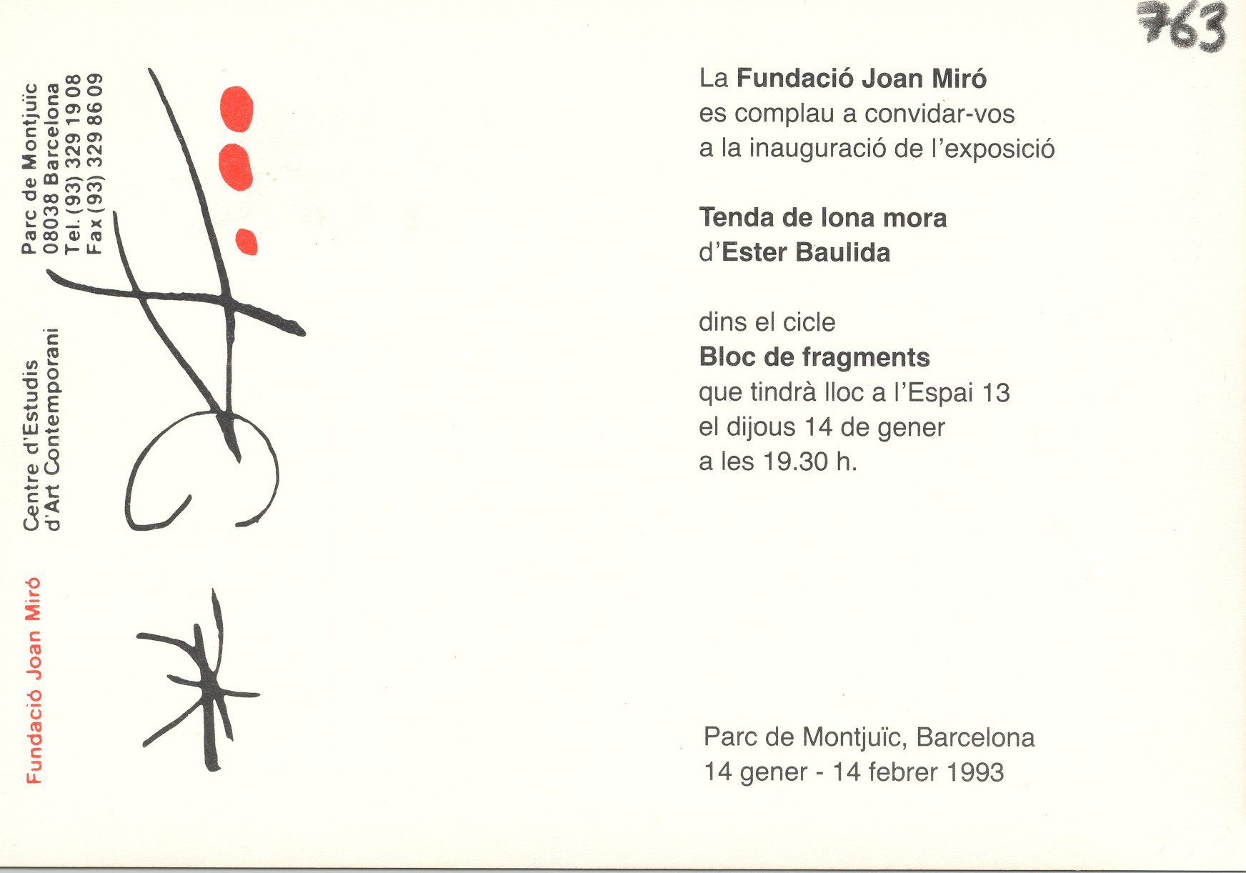 1993, gener, 14. Postal mecanoscrita. Invitació de la Fundació Joan Miró a l’exposició: Tenda de lona mora, d’Esther Baulida.