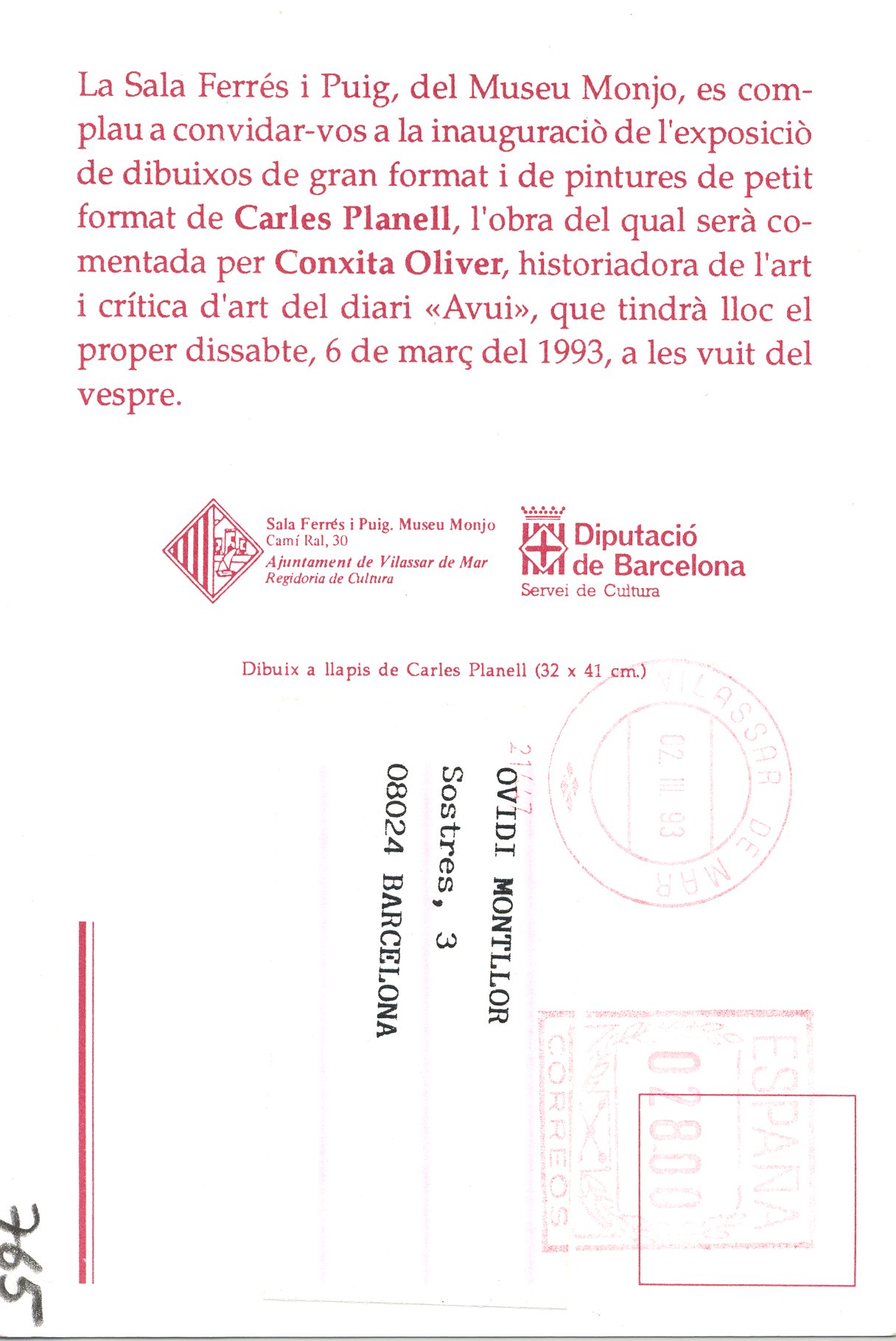 1993, març, 6. Postal mecanoscrita. Invitació de La Sala Ferrés i Puig del Museu Monjo a l’exposició de Carles Planell.