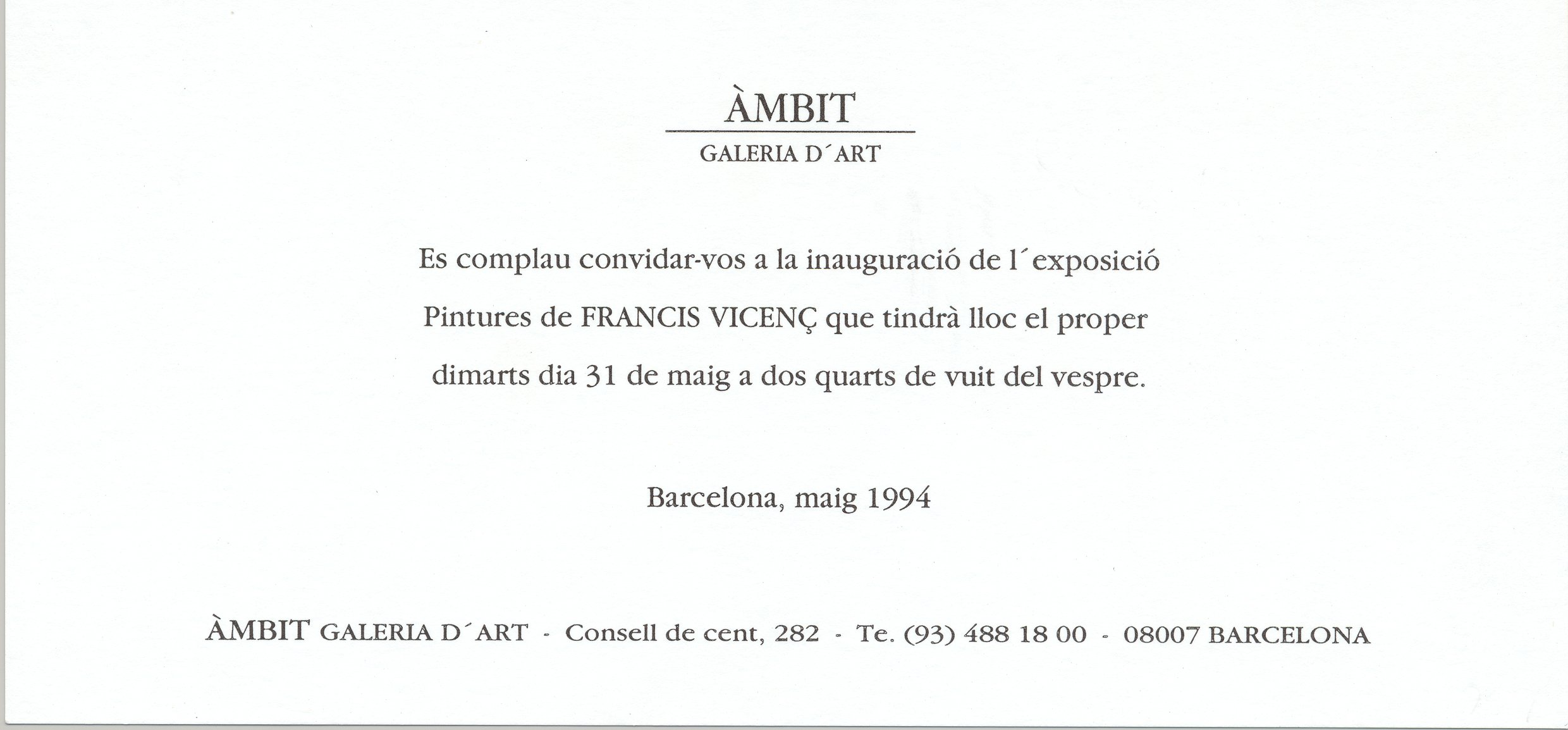 1994, maig, 31. Postal mecanoscrita. Invitació de la Galeria d’Art Àmbit a l’exposició de Francis Vicenç.