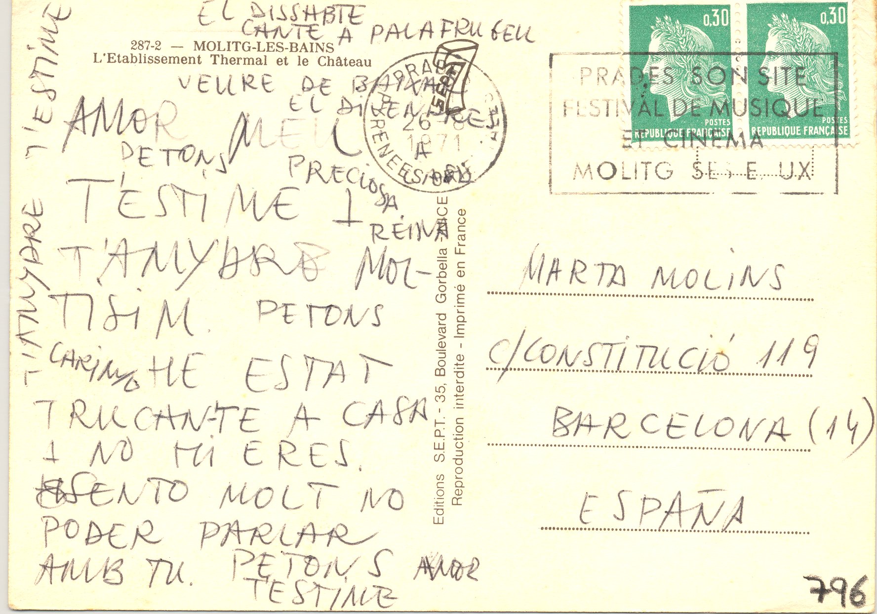 1971, agost, 26. Postal manuscrita. Per a Marta Molins.