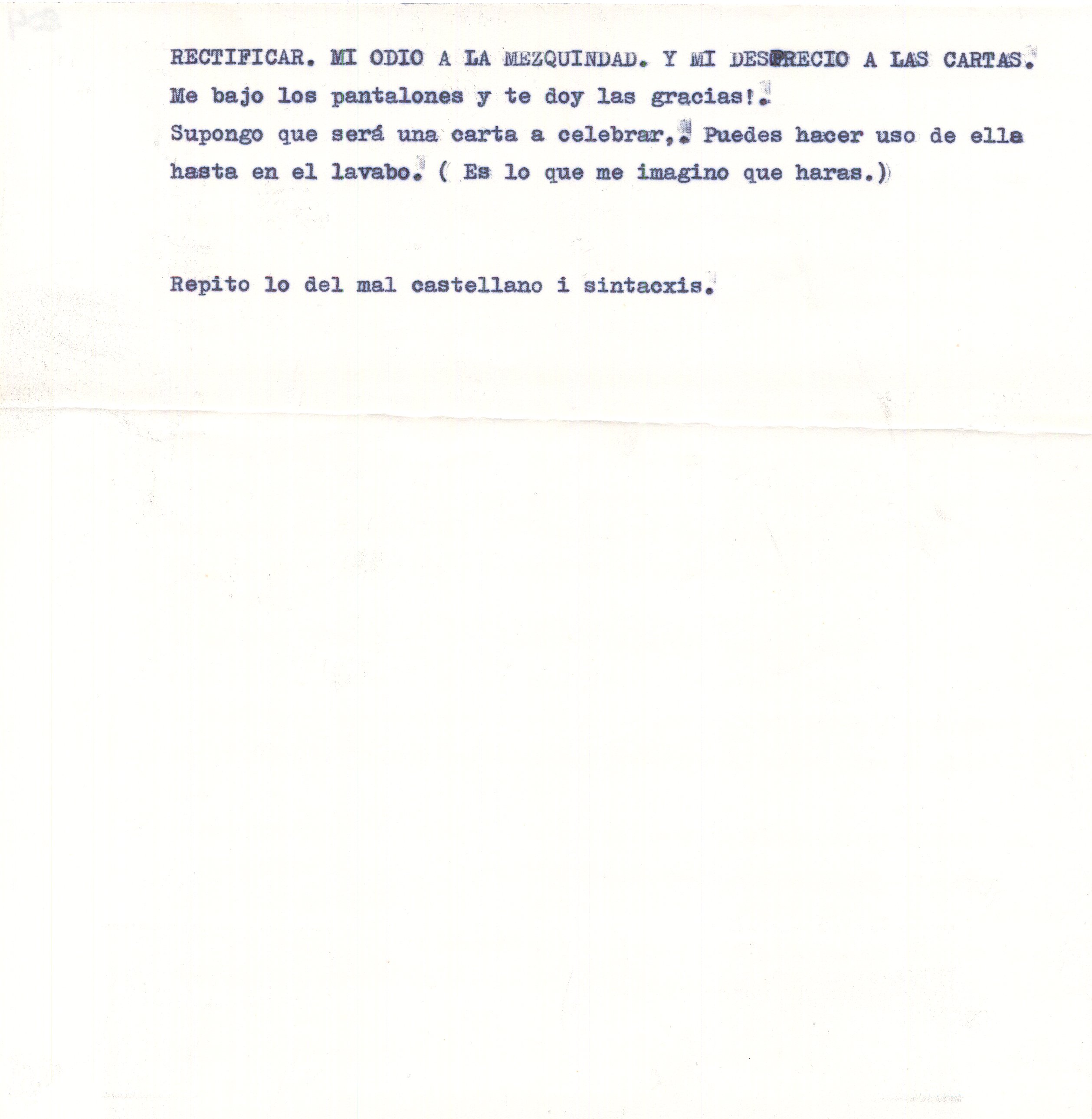 1981, agost, 12. Conjunt cartes mecanoscrites. 6 fulles. 1 sobre. Carta de Luis Cortés per O. M. i contestació d’O. M. a Luis Cortés. Laura; Manolo; Mira; Montse; Con el culo al aire; Gurea. San Sebastián; Pamplona.
