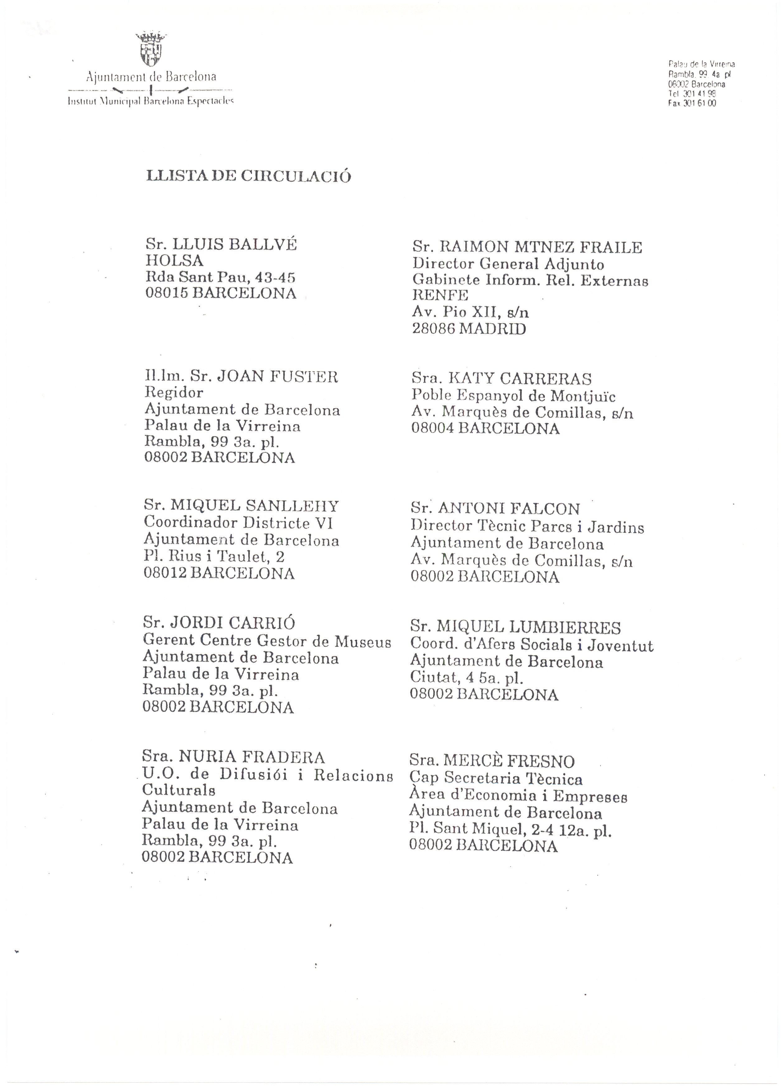 s.d. Llistat Teatres Personal: Directors, periodistes. Barna, Madrid. Carpeta. 18 fulls amb llistat d’adreces.