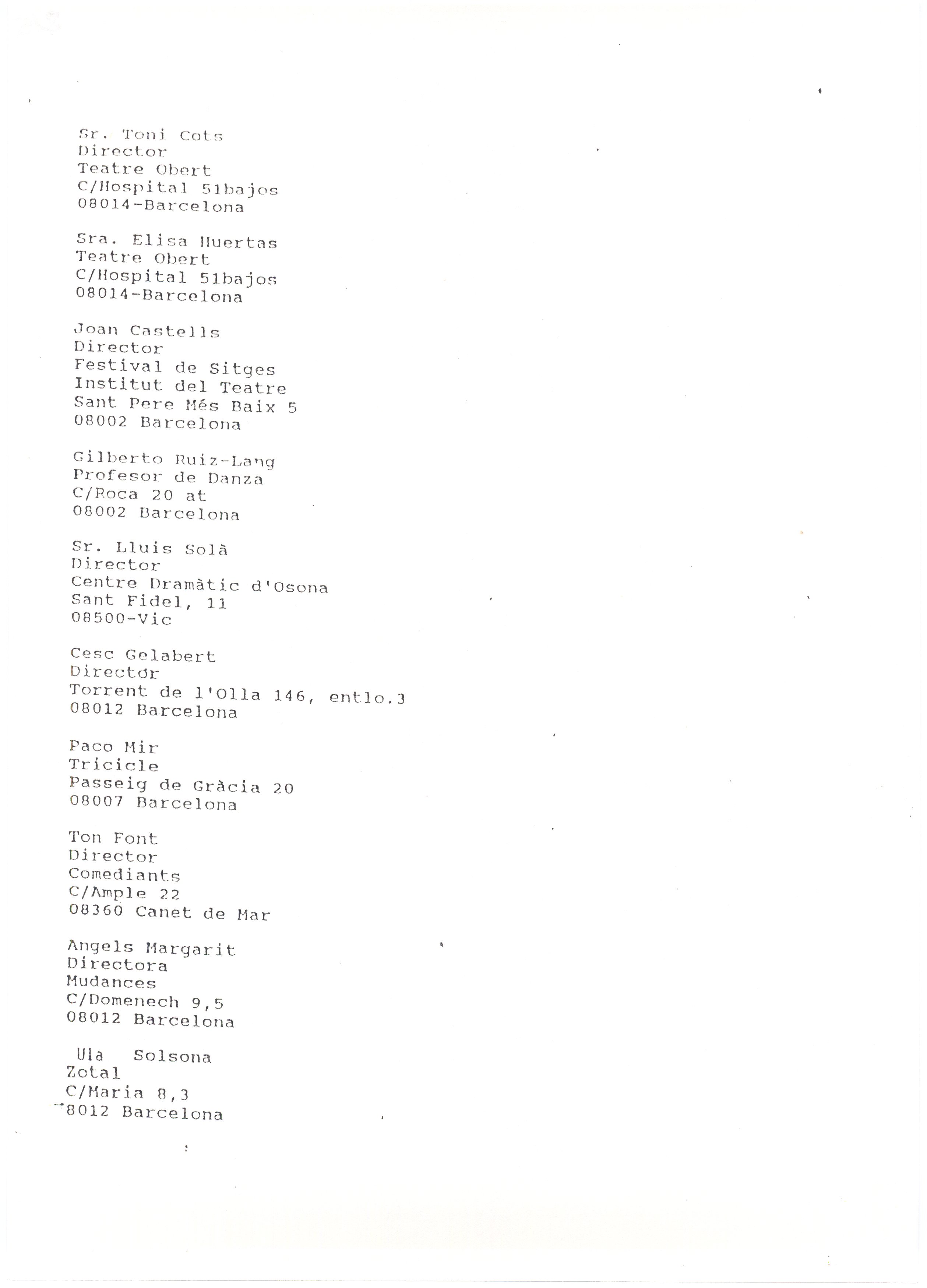 s.d. Llistat Teatres Personal: Directors, periodistes. Barna, Madrid. Carpeta. 18 fulls amb llistat d’adreces.