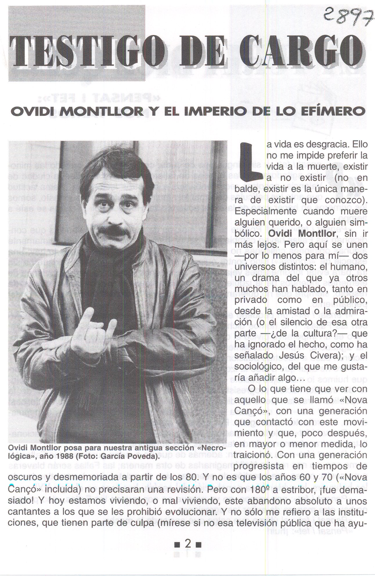 s.d. Cartelera Turia. “Ovidi Montllor y el imperio de lo efímero”. Enrique Herreras. Notícia de la mort d’O. M; s’ilustra amb 1 foto d’O. M.