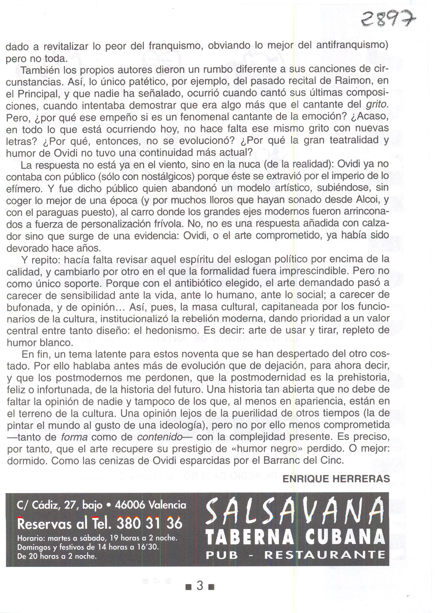 s.d. Cartelera Turia. “Ovidi Montllor y el imperio de lo efímero”. Enrique Herreras. Notícia de la mort d’O. M; s’ilustra amb 1 foto d’O. M.