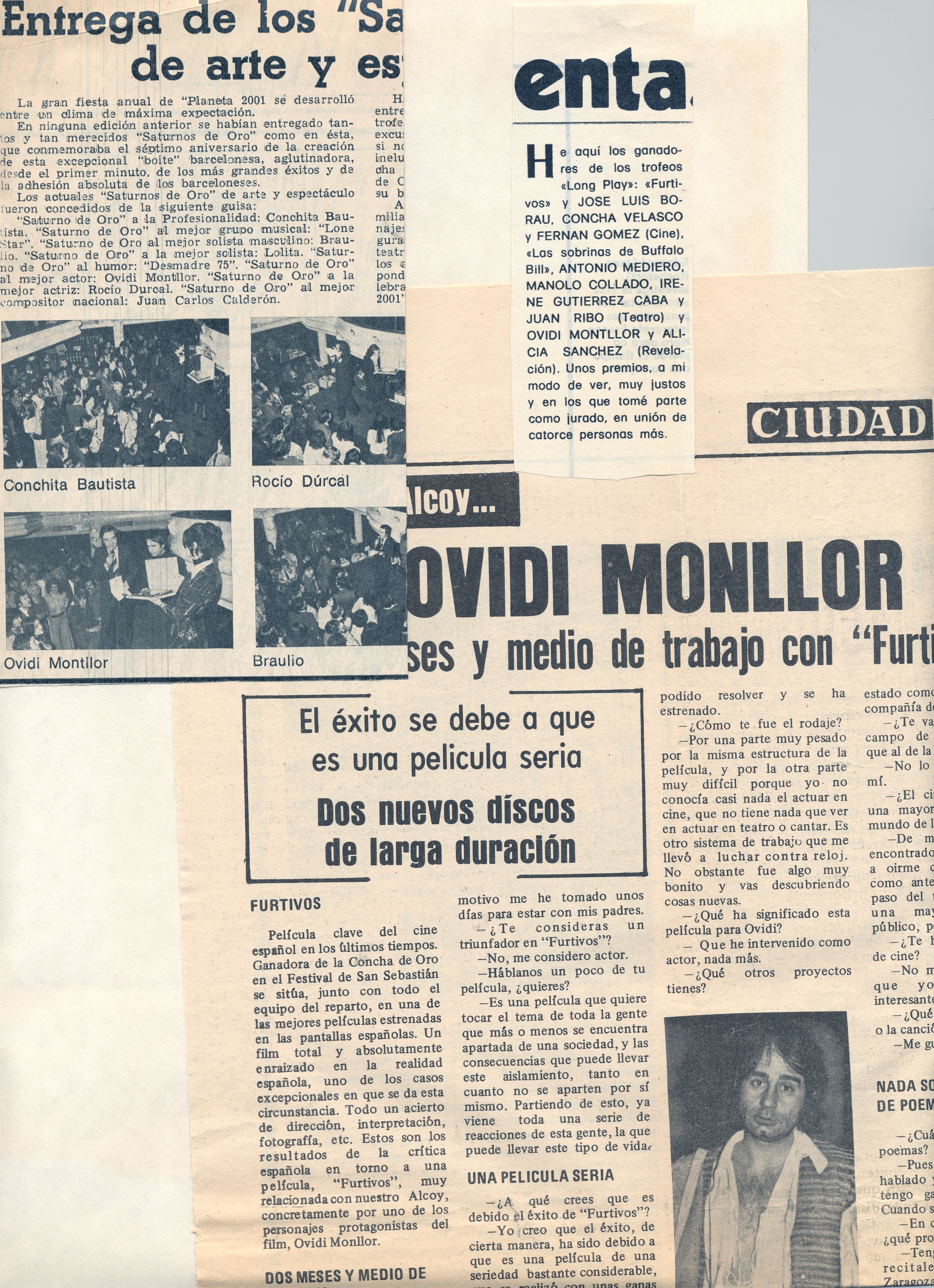 s.d. Ciudad. “Ovidi Montllor. Dos meses y medio de trabajo con Furtivos”. E.P. Entrevista, s’ilustra amb 2 fotos d’O. M. A més inclou breu dels guanyadors dels trofeus Long Play; i notícia de l’entrega dels Saturnos d’or d’art i espectàcul.