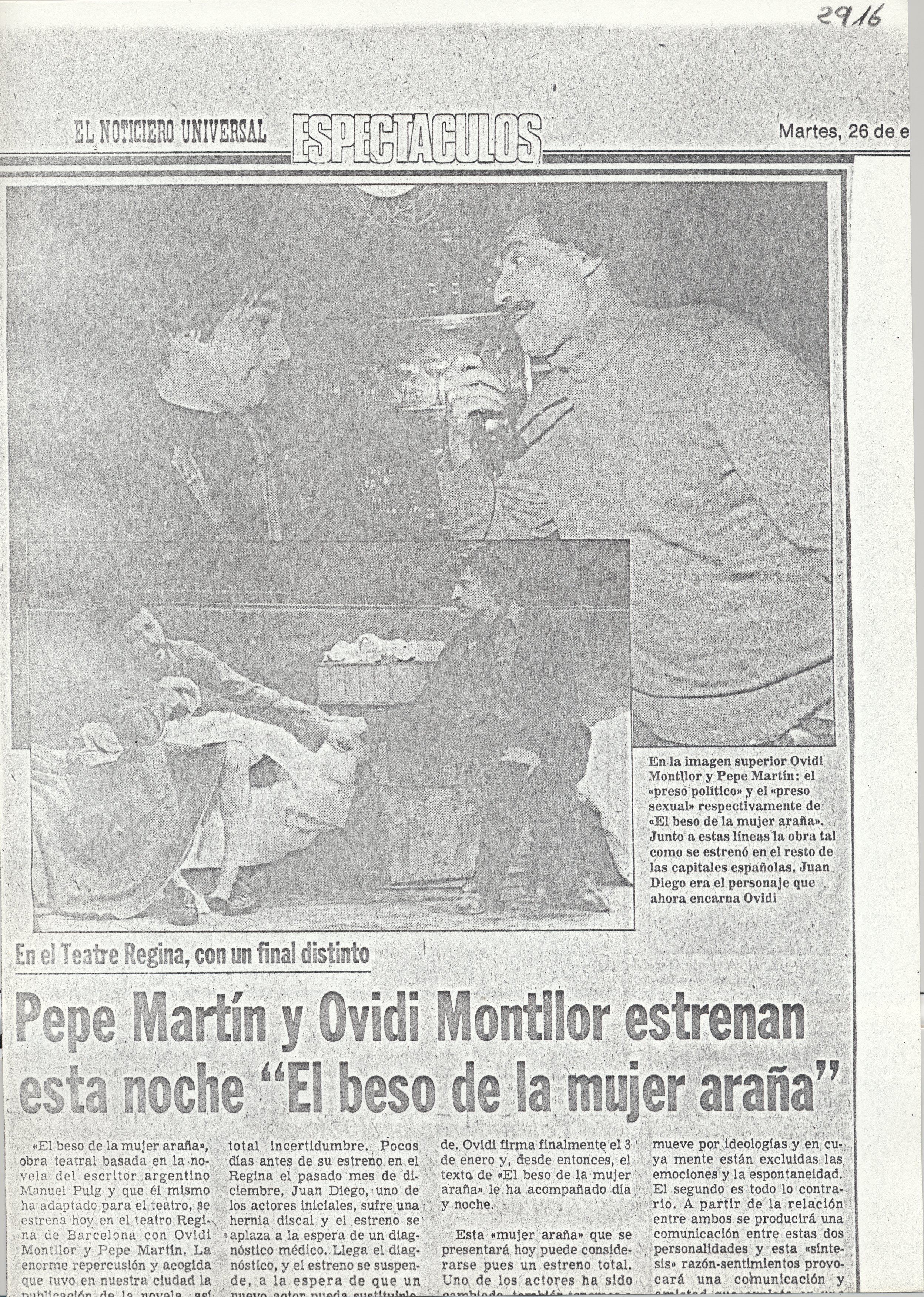 s.d. El Noticiero Universal. “Pepe Martín y Ovidi Montllor estrenan esta noche El beso de la mujer araña” Amb 2 fotos de l’obra.