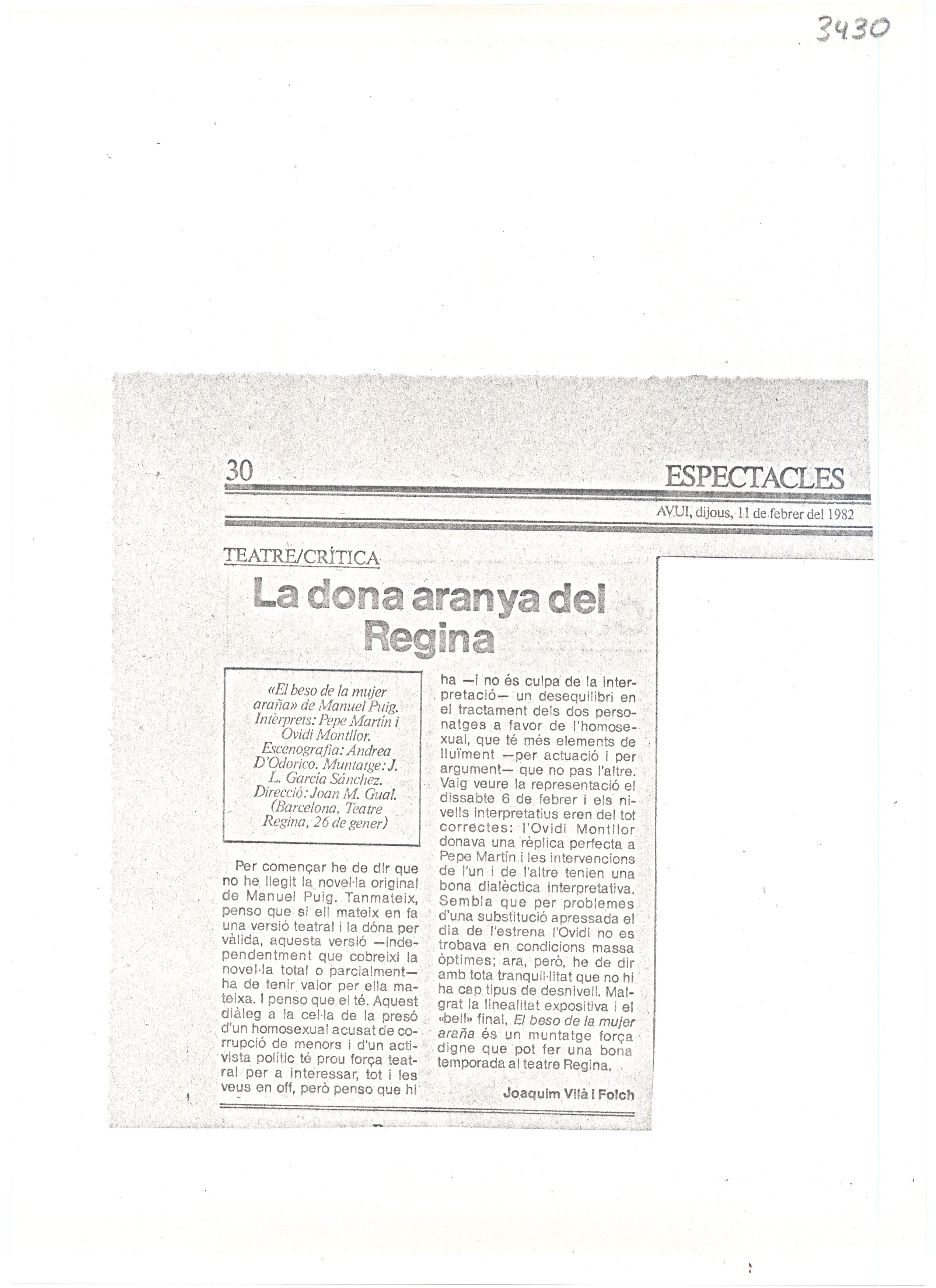 1982, febrer, 11. Avuí. “Teatre/Crítica. La dona aranya del Regina”. Joaquim Vilà Folch. Crítica teatral.