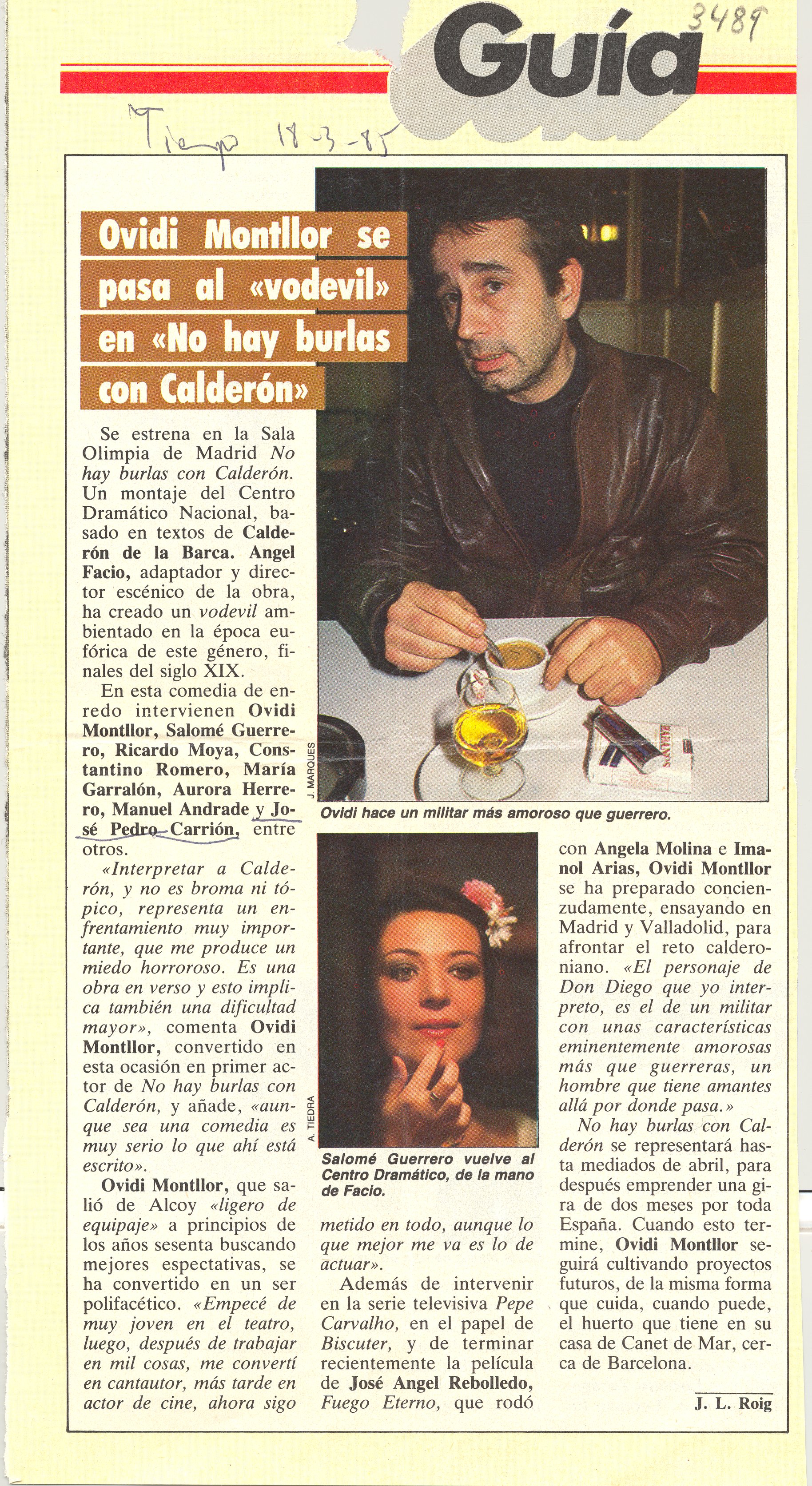 1985, març, 18. Tiempo. “Ovidi Montllor se pasa al vodevil en No hay burlas con Calderón”. J.L.Roig. Entrevista que s’ilustra amb 2 fotos d’O. M. i de Salomé Guerrero.