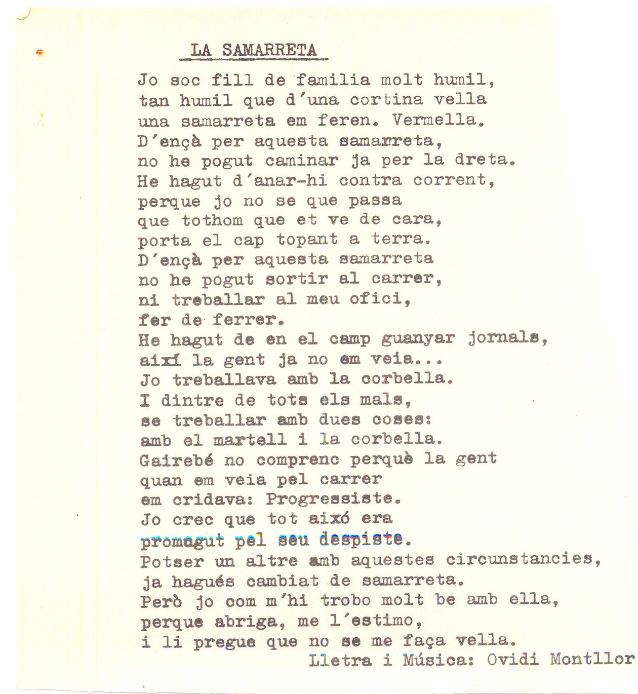 Mecanoscrit. 85 fulls. Carpeta Recull de cançons per a presentar a censura sense aprobar, ni compulsats. Alguns tenen anotacions manuscrites i algunes anotacions musicals. També inclou poemes d’altres autors musicats per O. M. Inclou entre altres: Cançó ficció; Homenatge a Teresa; Va com va; Sol d’estiu; Jo sóc amunt; La cançó del cansat; La Samarreta; A la vida; Tot explota pel cap o per la pota etc...