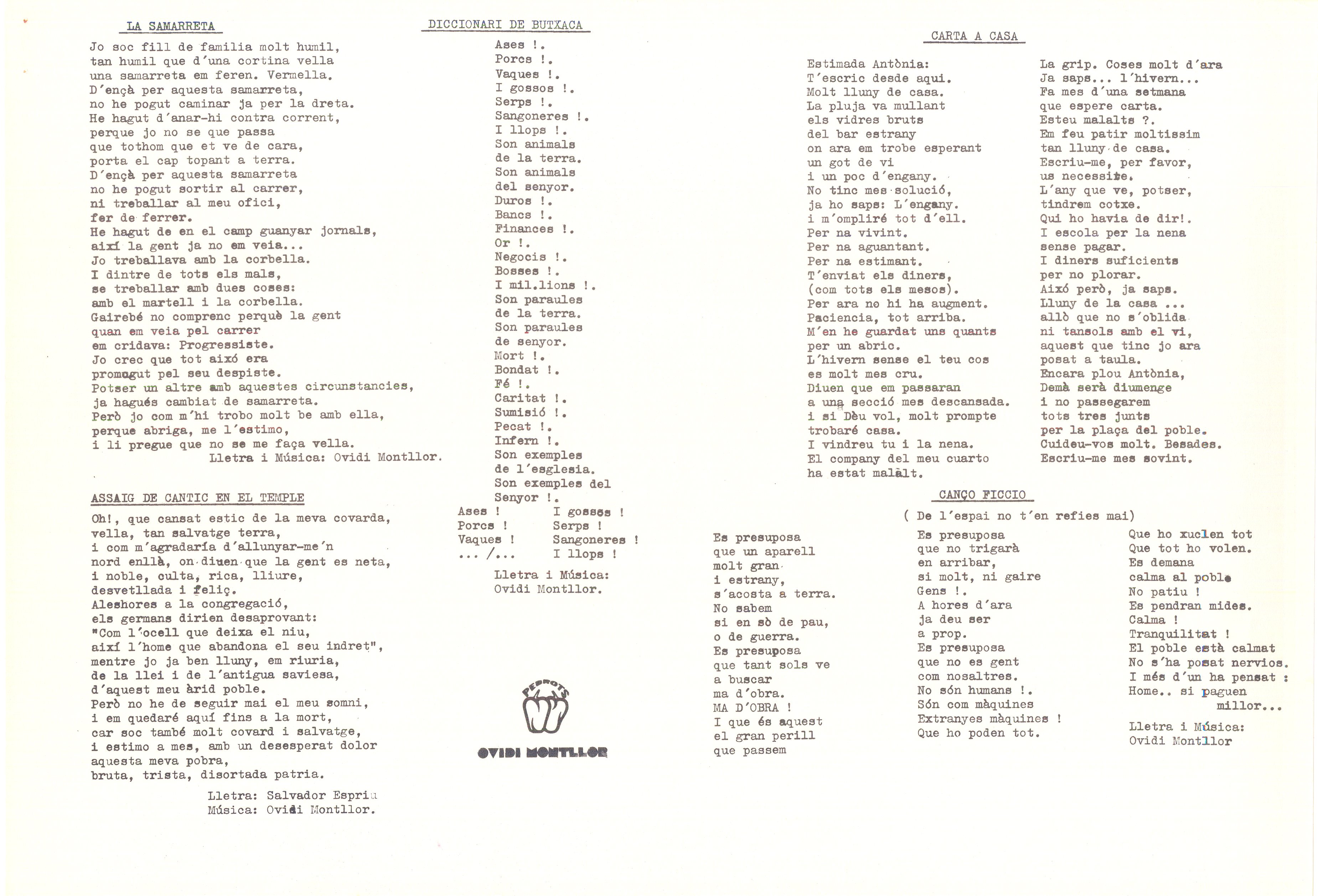 Mecanoscrit. 85 fulls. Carpeta Recull de cançons per a presentar a censura sense aprobar, ni compulsats. Alguns tenen anotacions manuscrites i algunes anotacions musicals. També inclou poemes d’altres autors musicats per O. M. Inclou entre altres: Cançó ficció; Homenatge a Teresa; Va com va; Sol d’estiu; Jo sóc amunt; La cançó del cansat; La Samarreta; A la vida; Tot explota pel cap o per la pota etc...