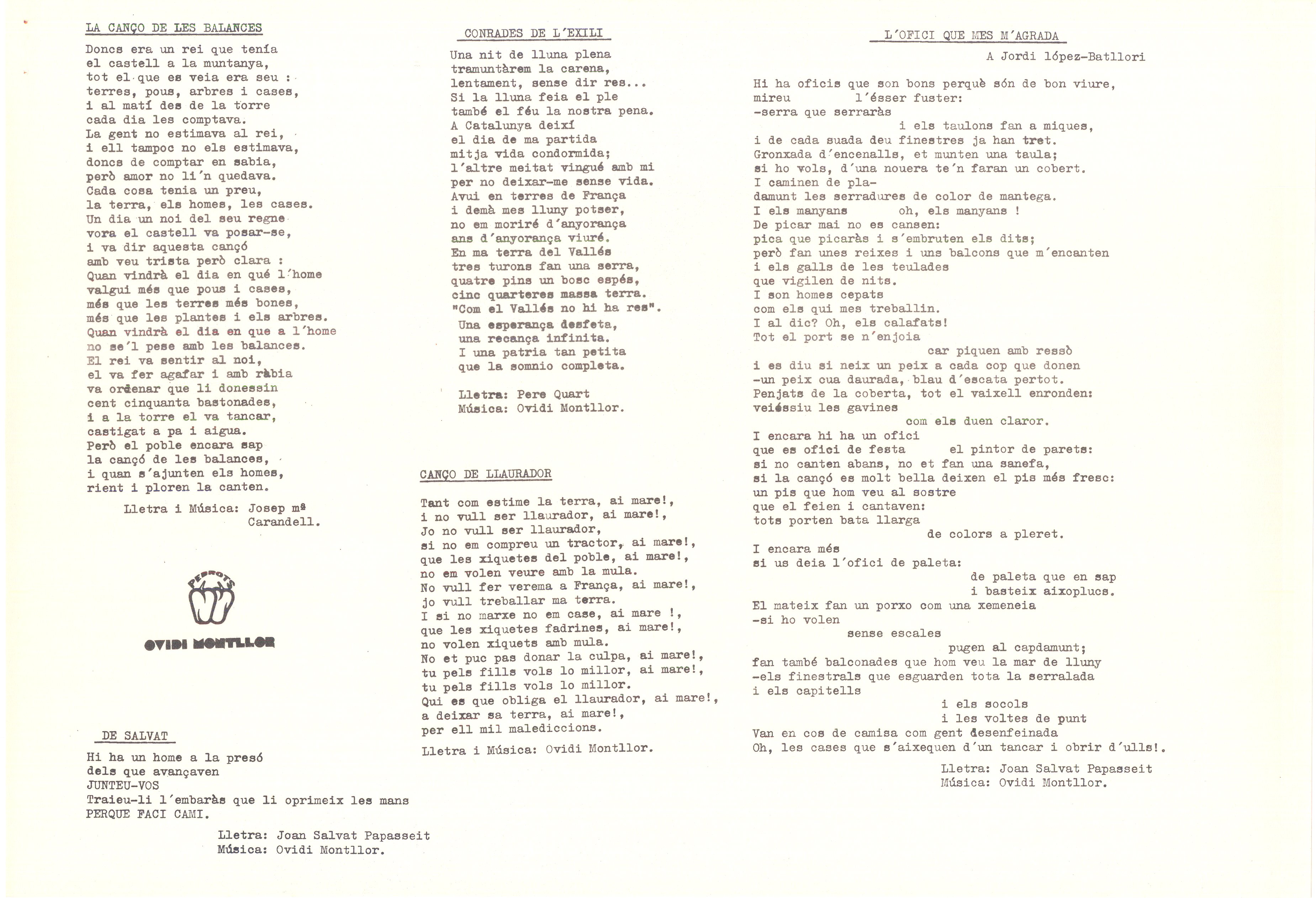 Mecanoscrit. 85 fulls. Carpeta Recull de cançons per a presentar a censura sense aprobar, ni compulsats. Alguns tenen anotacions manuscrites i algunes anotacions musicals. També inclou poemes d’altres autors musicats per O. M. Inclou entre altres: Cançó ficció; Homenatge a Teresa; Va com va; Sol d’estiu; Jo sóc amunt; La cançó del cansat; La Samarreta; A la vida; Tot explota pel cap o per la pota etc...