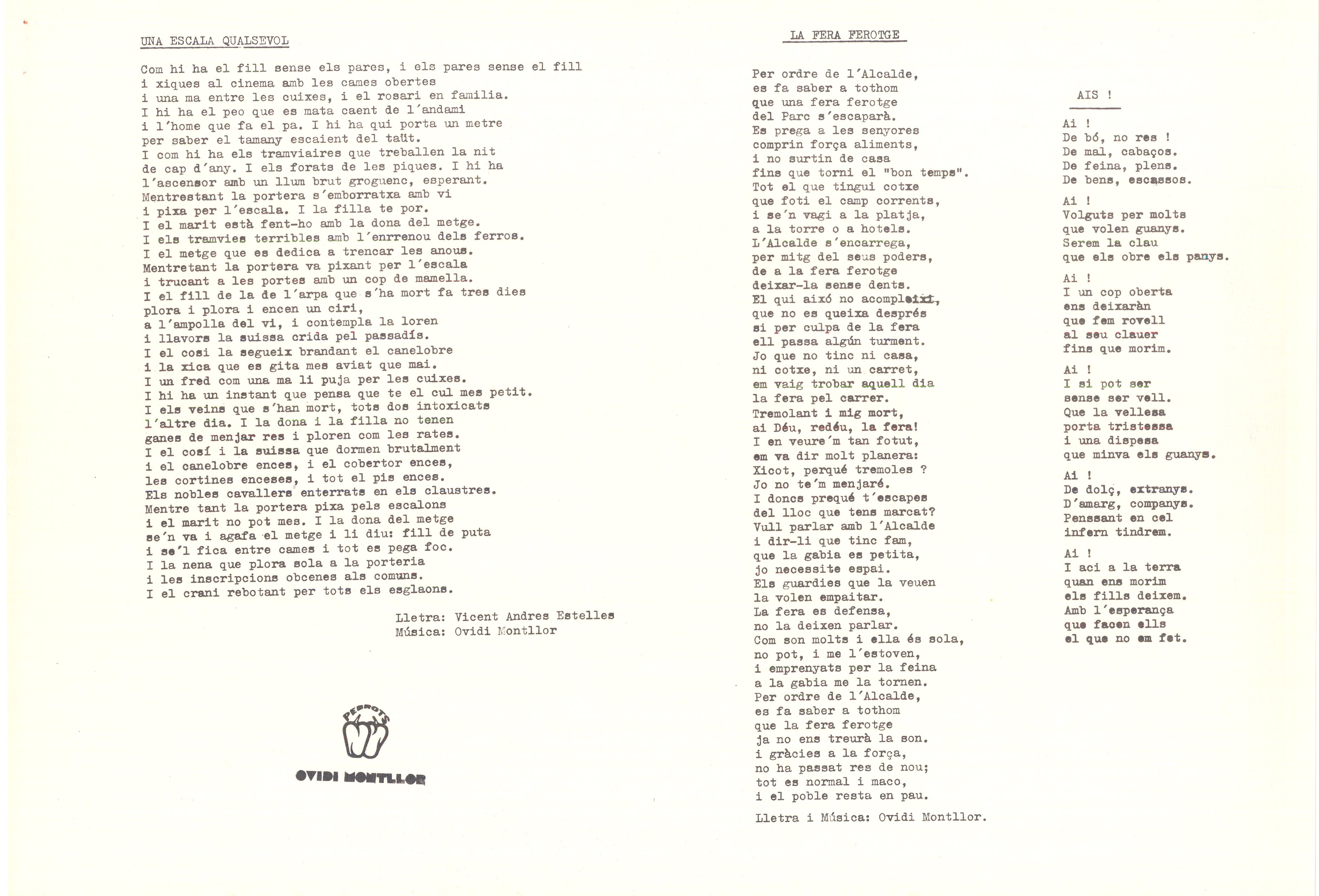 Mecanoscrit. 85 fulls. Carpeta Recull de cançons per a presentar a censura sense aprobar, ni compulsats. Alguns tenen anotacions manuscrites i algunes anotacions musicals. També inclou poemes d’altres autors musicats per O. M. Inclou entre altres: Cançó ficció; Homenatge a Teresa; Va com va; Sol d’estiu; Jo sóc amunt; La cançó del cansat; La Samarreta; A la vida; Tot explota pel cap o per la pota etc...