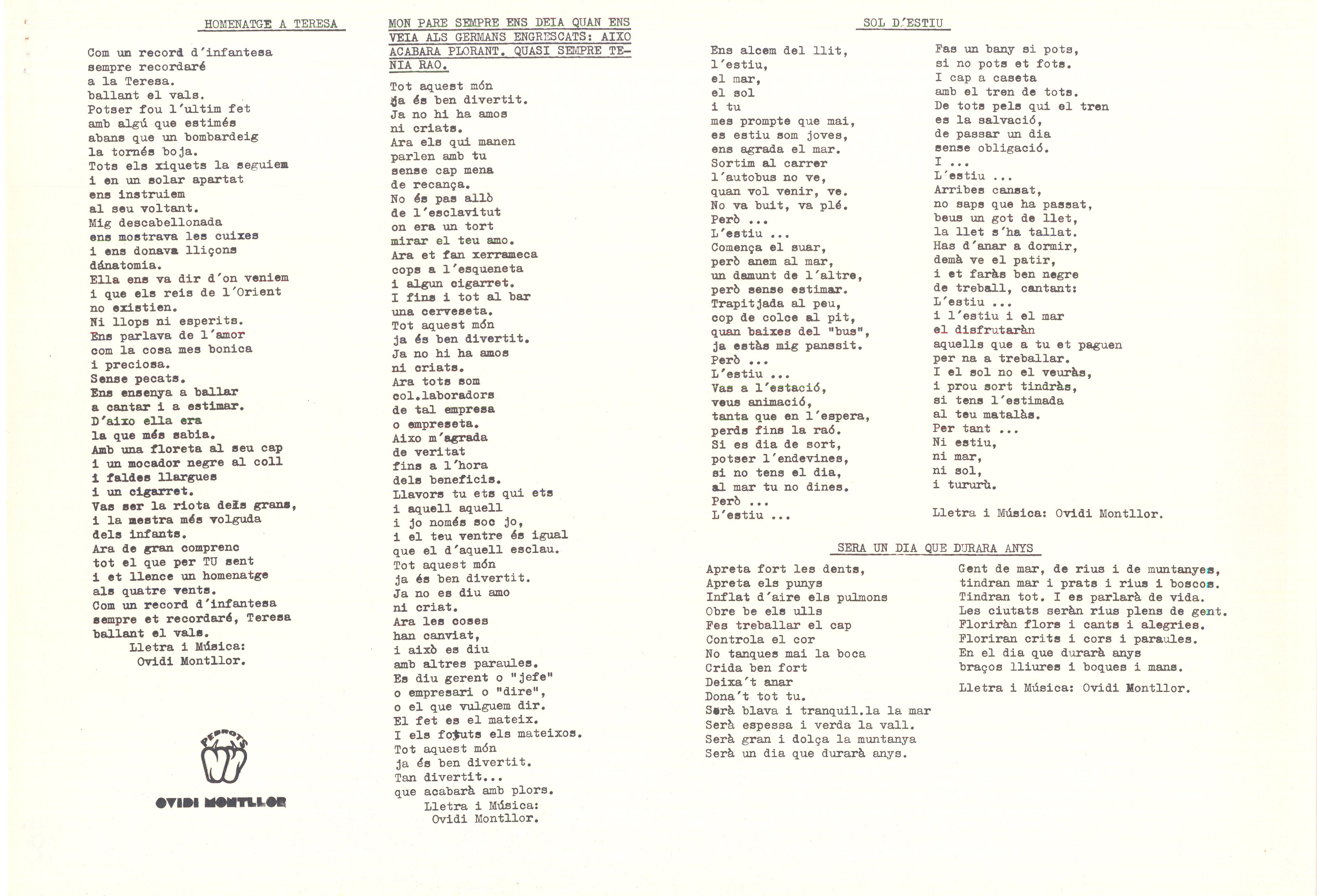 Mecanoscrit. 85 fulls. Carpeta Recull de cançons per a presentar a censura sense aprobar, ni compulsats. Alguns tenen anotacions manuscrites i algunes anotacions musicals. També inclou poemes d’altres autors musicats per O. M. Inclou entre altres: Cançó ficció; Homenatge a Teresa; Va com va; Sol d’estiu; Jo sóc amunt; La cançó del cansat; La Samarreta; A la vida; Tot explota pel cap o per la pota etc...