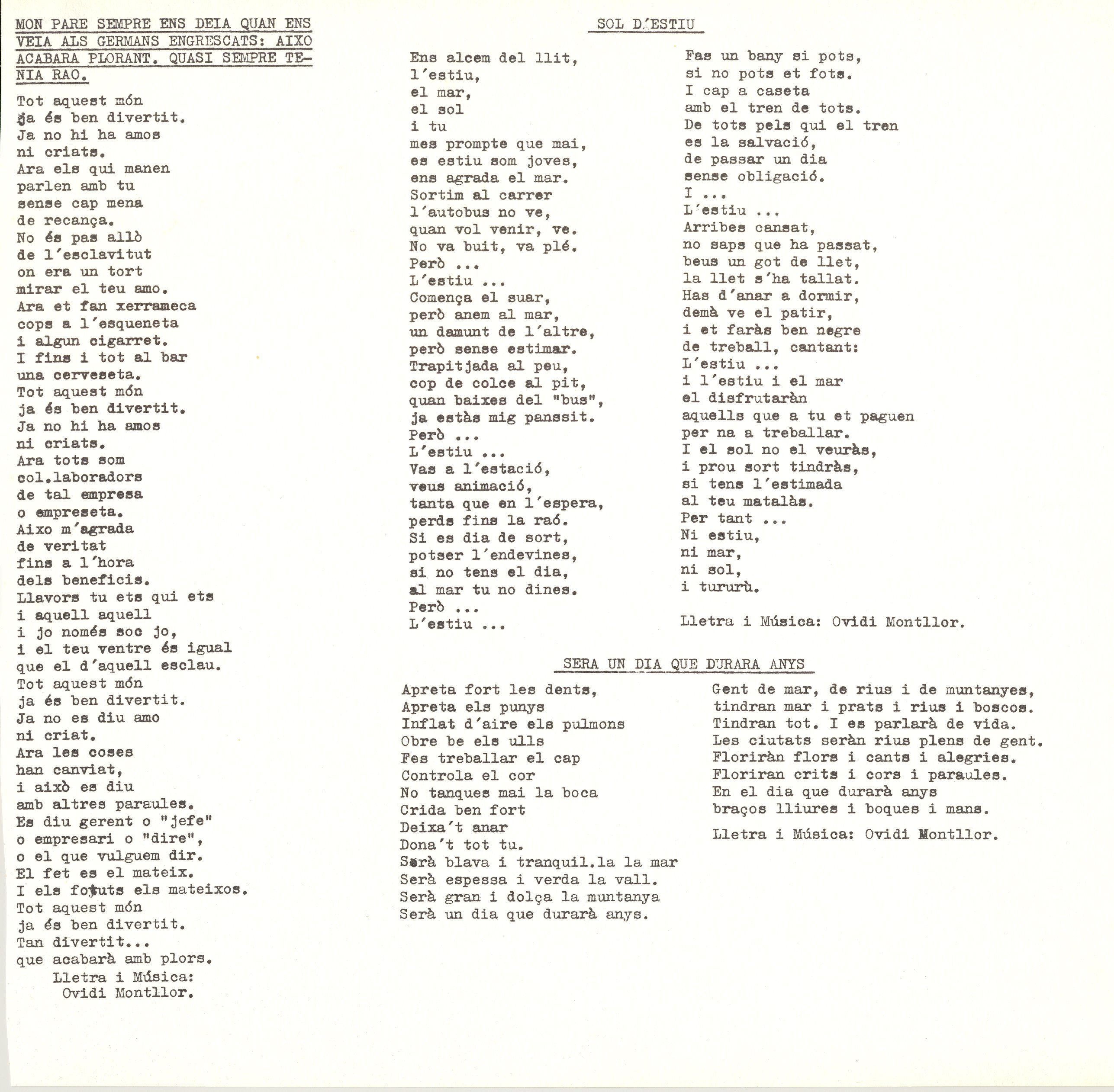 Mecanoscrit. 85 fulls. Carpeta Recull de cançons per a presentar a censura sense aprobar, ni compulsats. Alguns tenen anotacions manuscrites i algunes anotacions musicals. També inclou poemes d’altres autors musicats per O. M. Inclou entre altres: Cançó ficció; Homenatge a Teresa; Va com va; Sol d’estiu; Jo sóc amunt; La cançó del cansat; La Samarreta; A la vida; Tot explota pel cap o per la pota etc...