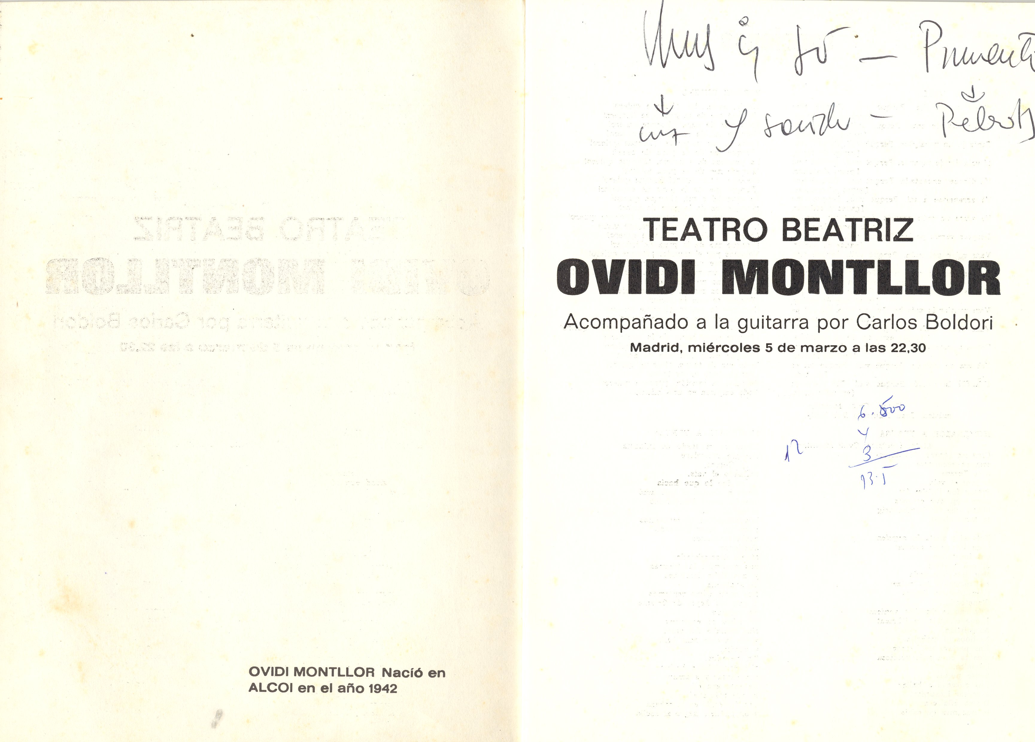 Mecanoscrit. 94 fulls. Carpeta. Muntatge per actuació a Madrid d’O. M. Inclou llistats de cançons, 2 programes de mà, presentacions de les cançons i traduccions de poemes al català, inclou poemes d’altres autors musicats per O. M. Entre altres Perquè vull; La fera ferotge; Als nous amos; Dos anònims; Als companys etc...