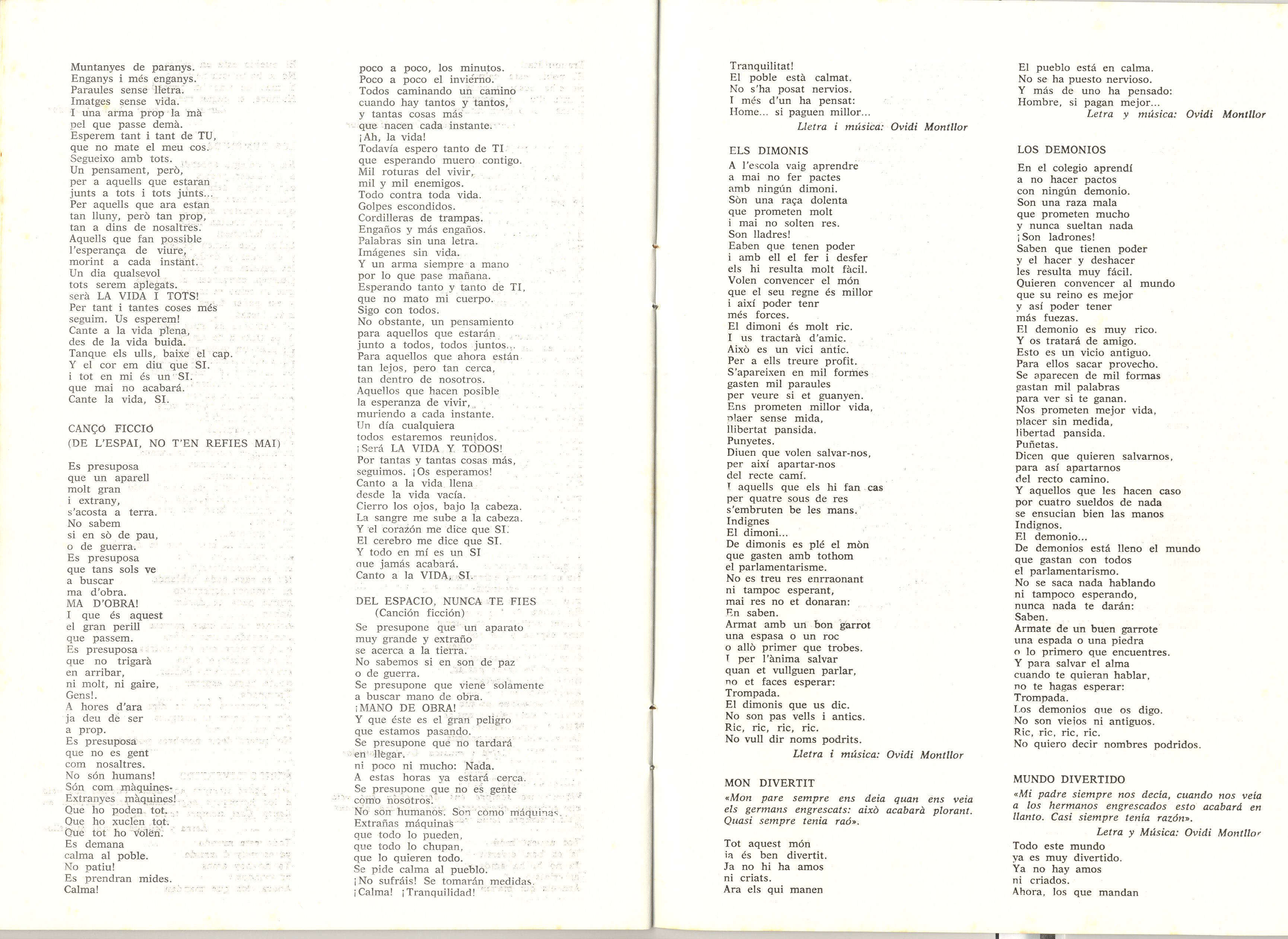 Mecanoscrit. 94 fulls. Carpeta. Muntatge per actuació a Madrid d’O. M. Inclou llistats de cançons, 2 programes de mà, presentacions de les cançons i traduccions de poemes al català, inclou poemes d’altres autors musicats per O. M. Entre altres Perquè vull; La fera ferotge; Als nous amos; Dos anònims; Als companys etc...